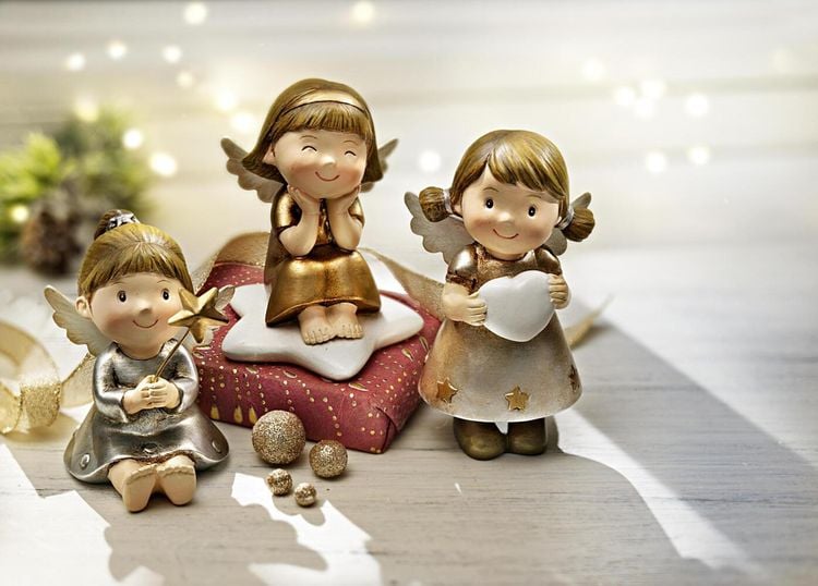 Dekorieren & schenken: Himmlisches Engelkinder-Trio Figuren bis 10 cm hoch Detailreich aus Kunststein gestaltetet Liebevoll von Hand bemalt, mit Gold-Akzenten Zauberhaft auf Fensterbank, Kommode, Gabentisch Deko-Figuren Engelkinder im 3er-Set Drei zauberhafte Engelkinder sind hier in Ihr Zuhause geschwebt: Während sich das eine Engelchen fröhlich auf seiner Sternenwolke ausruht, zeigen die beiden anderen stolz, was sie mitgebracht haben: Ein Herz und einen Stern, denn schließlich können wir alle viel Liebe und etwas Sternenzauber in unserem Leben gebrauchen Die aus Kunststein gefertigten Figuren sind detailreich gestaltet und liebevoll von Hand bemalt. Goldfarbene Akzente sorgen für himmlische Glanzmomente. Vielseitig und individuell zu dekorieren und verschenken Dekorieren Sie das zauberhafte Engeltrio als Gruppe oder einzeln auf Ihrer Fensterbank oder im Regal, lassen Sie die Engelkinder zum Blickfang auf Gabentisch oder Festtagstafel werden: Ihrer Deko-Freude sind keine Grenzen gesetzt. Ob im Set oder einzeln: die Engelkinder mit Goldglanz-Detail sind wunderbar auch als Mitbringsel oder Wichtelgeschenke - machen Sie lieben Menschen mit den kleinen Engelchen eine große Freude! Deko-Figuren Engelkinder im 3er-Set 3 Engelkinder im Set: Engel mit Stern, Engel mit Herz, Engel auf Sternwolke Figuren aus Kunststein rundherum detailreich ausgestaltet liebevoll von Hand bemalt, mit goldfarbenen Akzenten Größen der Figuren: 7 bis 10 cm hoch Himmlische Begleiter für Sie und Ihre Lieben: Bestellen Sie die Deko-Figuren Engelkinder im 3er-Set am besten gleich hier im Onlineshop.