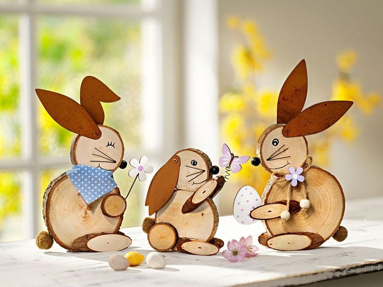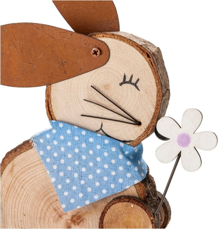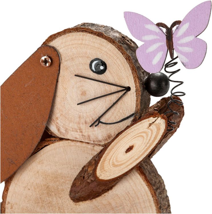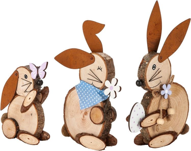 Hasenfamilie aus Kiefernholz & Metall 3 Größen, bis 19 cm hoch Hübsch bemalt, charmant dekoriert Zum Hinstellen Jedes Stück ein Unikat Dekofiguren "Familie Puschel" 3er-Set diese Hasen suchen ein Zuhause! Möchten Sie einem niedlichen, pflegeleichten Hasen-Trio ein neues Heim geben? Dann könnte die Familie Puschel demnächst auf Ihrem Fensterbrett wohnen. Auch wenn die drei gerne zusammenstehen, lassen sie sich wunderbar auch einzeln dekorieren. Jedes der Familienmitglieder ist aus sechs Baumstammscheiben sorgfältig zusammengefügt und auf der Vorderseite liebevoll bemalt. Die Baumstammrinde ist noch original erhalten, was der Deko ein rustikales Flair verleiht. Die natürliche Maserung des Holzes wirkt wie kuscheliges Hasenfell. Die Ohren sind aus Metall in Rost-Optik gefertigt und fest verschraubt. Jeder der drei Mümmler ist unterschiedlich dekoriert. Das niedlich gestaltete Hasen-Trio hat es sich zur Aufgabe gemacht, auch bei Ihnen Osterstimmung zu verbreiten. Greifen Sie zu! Dekofiguren Familie Puschel" 3er-Set: - 3 Baumstammfiguren im Hasendesign - jede Figur aus 6 Baumscheiben mit Rinde - Schwanz aus 100% Polyester - sorgfältig bemalt (einseitig) - Ohren aus rostfarbenem Metall (verschraubt) - Schnurrhaare aus Draht Maße (L x B x H): 12 x 25 x 19 cm / 12 x 25 x 18 cm / 14 x 25 x 11 cm Setzen Sie gut gelaunte Akzente in Ihrer Osterdeko und bestellen Sie gleich hier online Dekofiguren Familie Puschel" 3er-Set.