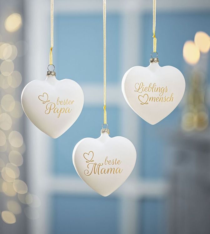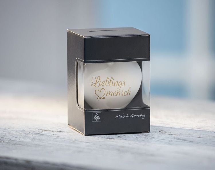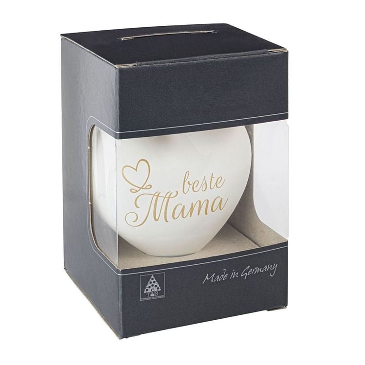 Geschenk-Idee für Herzensmenschen 8 cm groß Aus Glas mit Widmung Made in Germany Metallicfarbene Zierschrift Herz zu verschenken: Dekohänger Herz mit Botschaft Eine wunderbare Form einem lieben Menschen tiefe Zuneigung zu zeigen! Mit diesem Herz sagen Sie Dankeschön für so viel Liebe und Nähe ... und bleiben gleichzeitig in ewiger Erinnerung. Der ausdrucksstarke Anhänger findet sicher einen besonderen Platz im Herzen des Beschenkten und in seinem Zuhause. Ein Blickfang an Deko-Ästen, an Fenster, Leselampe oder Gardinenstange. Auch gelegt zaubert das Glasherz viel Liebe in all Ihre Räume! Hochwertig gearbeitet Made in Germany Es ist eine Kunst ein Herz aus Glas zu formen. Das feine Material ist vom Thüringer Glasdesign kunstvoll in Form gebracht worden. Sie verschenken also einen Deko-Anhänger, der sorgfältig in Deutschland gearbeitet wurde. Zusätzlich ist jedes Herz mit einer Widmung versehen. Detail: Die Zierschrift schimmert in einem edlen Edelmetall-Farbton. Das rundet das Design elegant ab. Dekohänger Herz mit Botschaft aus Glas in mattiertem Weiß Made in Germany mit Metall-Krone zum Aufhängen Widmung in eleganter Zierschrift Beschriftung "Beste Mama" in schimmerndem Goldton sorgfältig und bruchfest verpackt in hochwertiger Geschenkbox Größe 8 cm Zeigen Sie Ihre tiefe Verbundenheit auf eine ganz besondere Weise. Der Dekohänger Herz mit Botschaft ist ein wunderbares Stück Glas-Design, das mehr ausdrückt als tausend Worte. Jetzt gleich in den Warenkorb legen und noch heute bei uns online kaufen!