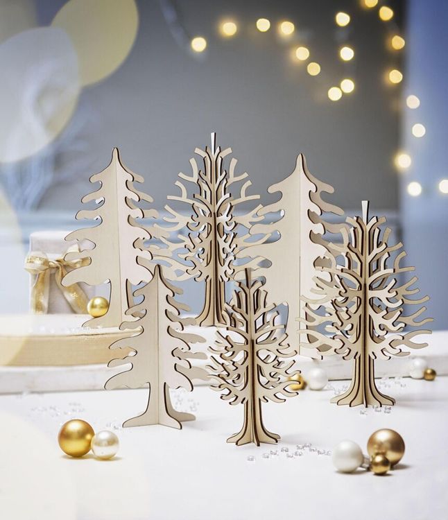 Deko-Bäumchen zum Zusammenstecken Höhe bis zu 24 cm Aus Holz mit abgetönten Kanten 2 unterschiedliche Designs im Set Einfach aufzubauen Raffinierte Deko-Idee: Dekoholzbäume Natur zum Stecken, 6er-Set Alles in allem erhalten Sie 6 dekorative Holzbäume, die an den Kanten kunstvoll abgedunkelt sind. Das verleiht den Dekostücken Tiefe und unterstreicht die jeweilige Baumform perfekt! 2 Designs im Set: Die eine ist eine klare Tannen-Form, die andere bezaubert mit vielen feinen Verästelungen wie Laubbäume, die im Winter ihre Blätter abgeworfen haben. Einfach zusammenzubauen Ruckzuck werden aus flachen Holz-Teilen prächtige, plastisch wirkende Bäume! Das geht einfach und schnell und genau so fix sind die verschiedenen Segmente wieder auseinandergebaut und verstaut. Die Holzbäumchen werden aus den vorgefertigten Teilen zusammengesteckt. Sie benötigen keinen Kleber! Durch die dadurch entstehende plastische Form bekommen die Bäume sozusagen einen Wurzelfuß, der sie standfest macht. Dekoholzbäume Natur zum Stecken, 6er-Set aus Holz (Sperrholz) mit effektvoll abgedunkelten Kanten 2 Designs im Set: je 3 x Tanne und Laubbaum mit Verästelungen einfach & schnell zusammenzustecken standfest durch dreidimensionale Form Maße: Tannen Höhe 11,5/ 21/ 24 cm; Ø 15/ 16/ 18 cm. Laumbaum Höhe 15/ 21/ 24 cm; Ø 10/ 14/ 16 cm Für einen dekorativen Winterwald: Die Dekoholzbäume Natur zum Stecken, 6er-Set, können Sie im Set oder einzeln aufstellen. Ergänzen Sie mit Lichterhäuschen oder LED-Lichterketten, kleinen Wichtelfiguren oder Waldtieren aus Ihrem Deko-Fundus. Auch eine tolle Geschenk-Idee für viele Gelegenheiten. Jetzt gleich in den Warenkorb legen und noch heute bei uns online kaufen!