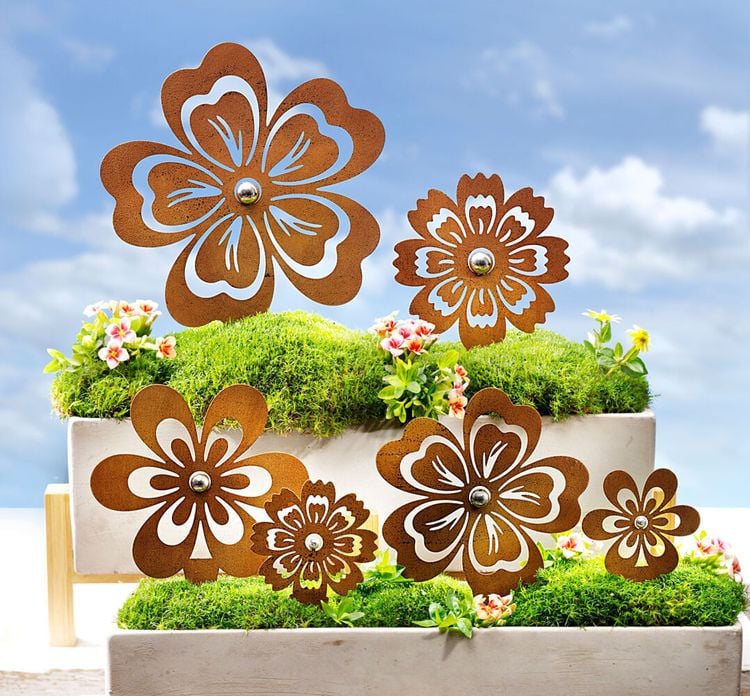 Immerwährender Blumenschmuck für Beet, Balkonkasten, Pflanzschalen Ø der Blüten: 6 bis 16 cm 6 Silhouettenmotive aus Metall mit Rostfinish Verziert mit silberglänzenden Edelstahlkugeln Geeignet für drinnen & draußen Fix dekoriert: einfach in den Boden stecken! Dekostecker Blümchen 6 blütenfrische Accessoires für Haus & Garten Ob Sommer oder Winter, ob drinnen oder draußen: diese Blumenstecker schmücken immer und überall und das im Handumdrehen. Stecken Sie die Metall-Blümchen einfach in Beet oder Rasen, in den Balkonkasten oder Blumentöpfe, in Gestecke oder Dekoschalen Einzeln sind die Dekostecker süße Blickfänger, mit dem ganzen Set zaubern Sie eine charmante Blumenwiesen-Szenerie. Auch charmant als Geschenk oder Mitbringsel. Unser Tipp: Am besten gleich mehrere Sets bestellen! Dekostecker Blümchen , 6er-Set: 6 unterschiedliche Silhouettenmotive mit Durchbrüchen aus Metall, beidseitig Finish im Rost-Look mittig je eine Glanzkugel aus Edelstahl mit Bodenspieß zum schnellen Dekorieren Größen: Blüten-Ø ca. 6 bis 16 cm Jetzt blüht Ihnen schnelle, originelle Ganzjahres-Deko! Dafür einfach die Dekostecker Blümchen im 6er-Set online hier bestellen.