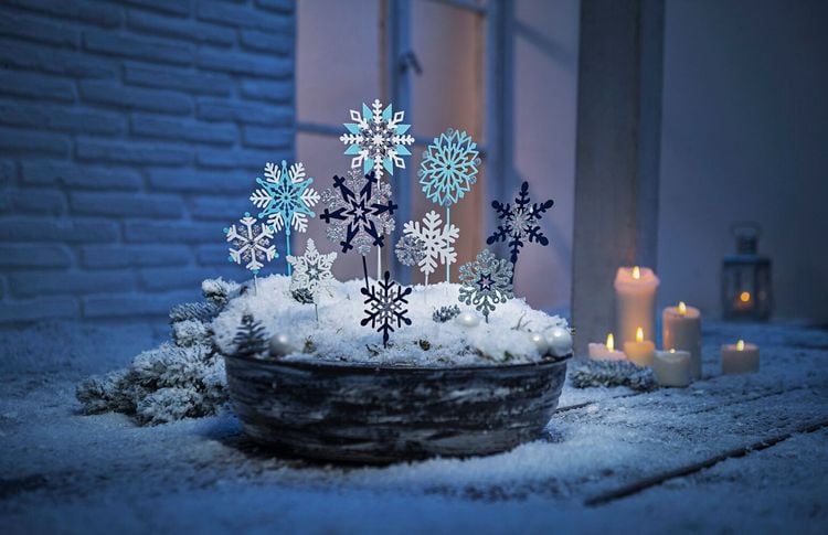 10 Eiskristalle als schnelle Deko für drinnen & draußen Set mit 2 Größen: 26 bzw. 34 cm hoch Silhouetten aus Metall, beidseitig koloriert Partiell mit Silberglitter veredelt Ideal für Balkonkasten, Blumentöpfe & Co. Tipp: auch schön auf einem Geschenk, als Mitbringsel Dekostecker Eisblumen , 10er-Set: Winterzauber im Handumdrehen! Hier glitzern Eiskristalle in unterschiedlichen Farben und Formen um die Wette. Die Metall-Silhouetten sind beidseitig in kühlen Winterfarben lackiert und mit Silberglitter veredelt. Das Beste: Diese Eisblumen am Stab sind wirklich blitzschnell dekoriert einfach einstecken, fertig! Ganz zauberhaft wirken die Dekostecker Eisblumen einzeln oder im Grüppchen, drinnen oder draußen: im Blumentopf auf der Fensterbank oder im Adventsgesteck, integriert im Tischschmuck auf der Weihnachtstafel, im Vorgarten, Balkonkasten, Pflanztrog Einzelne Dekostecker eignen sich auch hervorragend als i-Tüpfelchen auf dem Geschenk oder als kleines Mitbringsel. Dekostecker Eisblumen , 10er-Set: Silhouetten aus Metall, unterschiedliche Motive kunstvoll und filigran gestaltet beidseitig lackiert in Hellblau, Dunkelblau und Weiß partiell veredelt mit Silberglitter auf Metallstab Maße: 5 Stecker mit Motiv-Ø 6 cm, Länge Erdspieß 20 cm + 5 Stecker mit Motiv-Ø 9 cm, Länge Erdspieß 25 cm Das 10er-Set Dekostecker Eisblumen am besten gleich hier im Onlineshop bestellen!