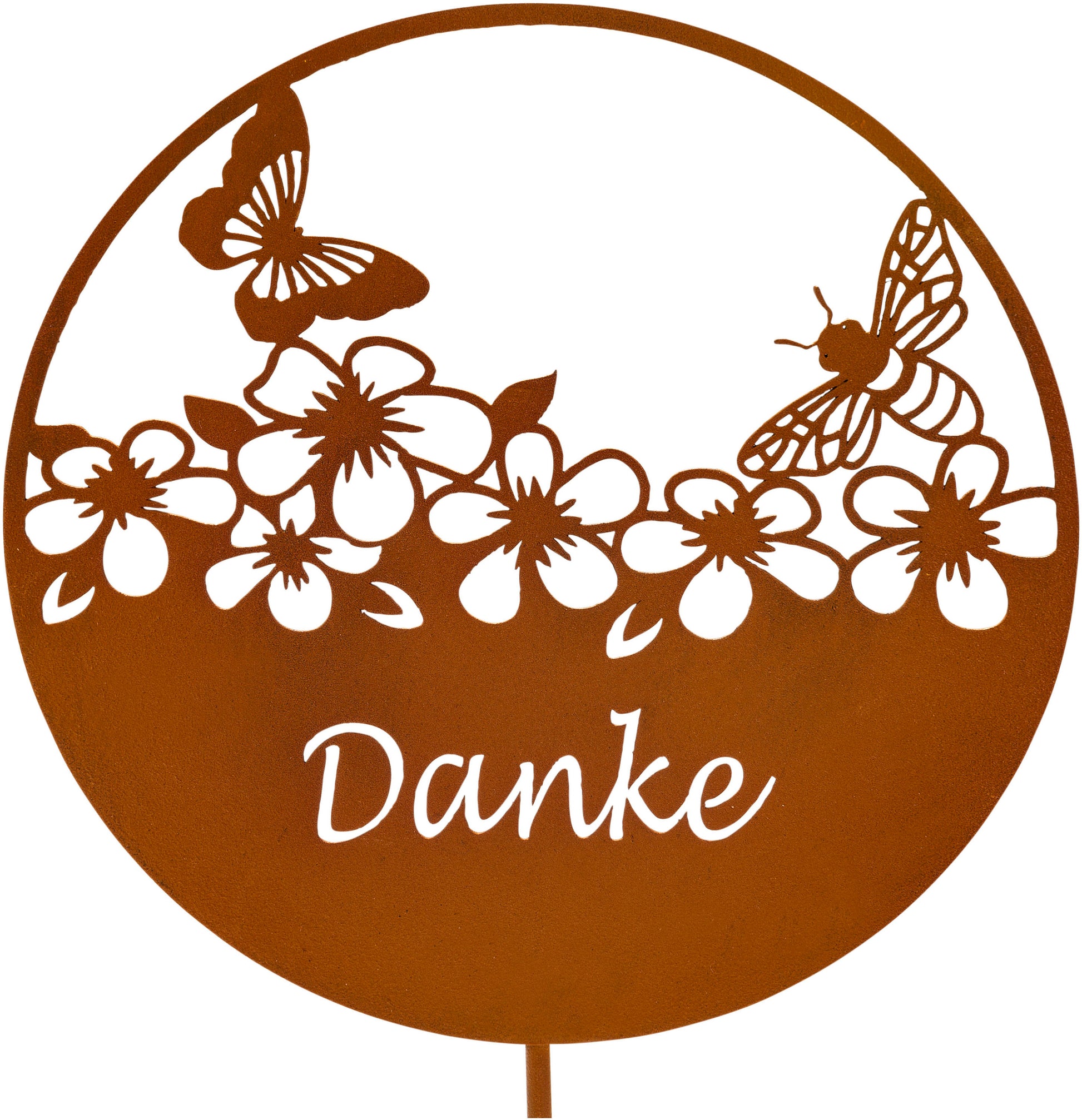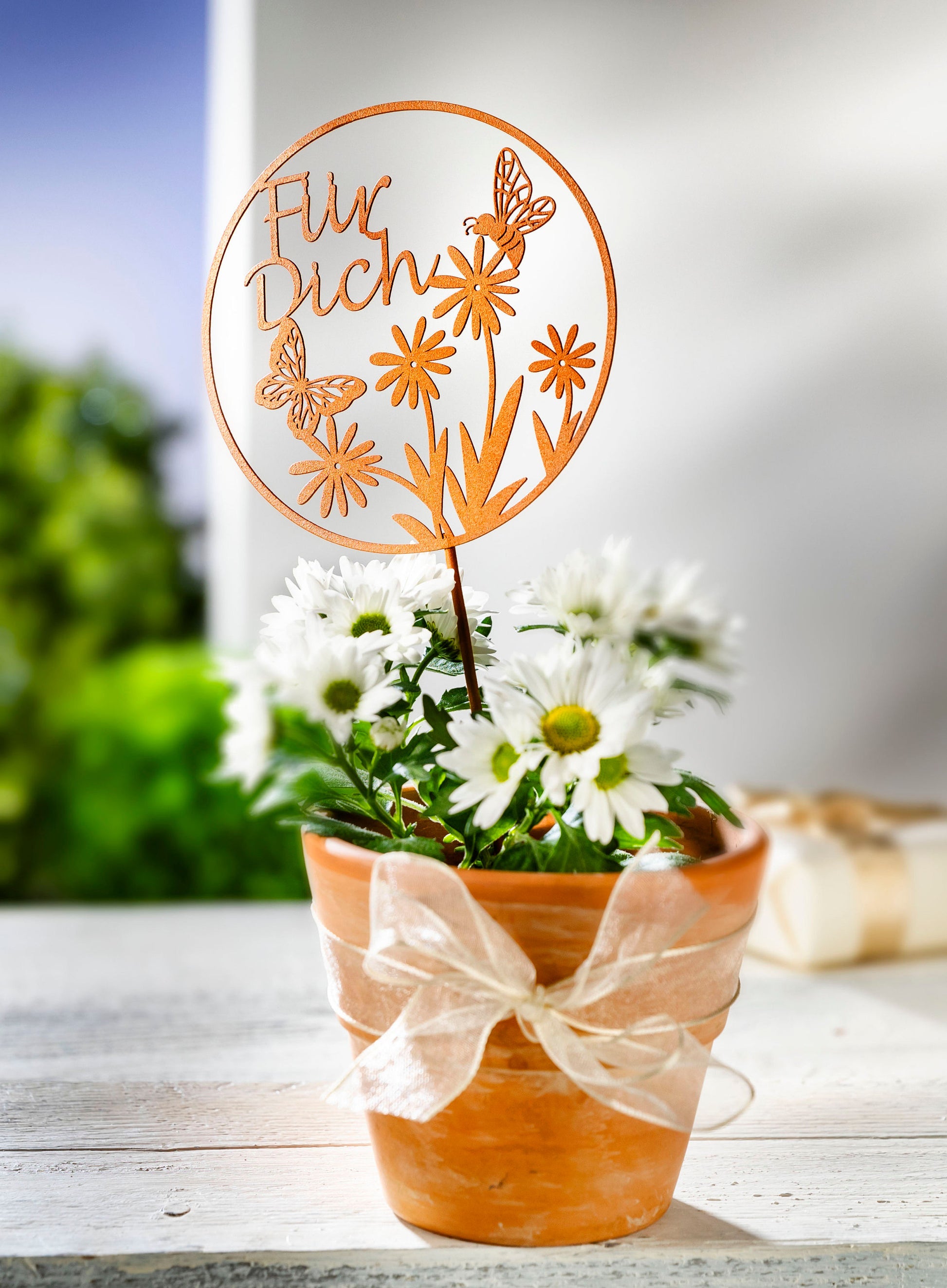 Versehen Sie Ihre Geschenke mit einer besonderen Aufmerksamkeit: Ob in einer Topfblume oder einem Blütengesteck - die Dekostecker mit Spruch übermitteln dem Beschenkten mit jedem Präsent noch eine liebevolle Botschaft. So können Sie auf besonders dekorative Weise zum Beispiel "Danke" sagen oder jemandem einen "Glückwunsch" überbringen. Jeder der fünf Dekostecker ist in Metall in lackierter Rostoptik gefertigt und unterschiedlich in Scherenschnitt-Optik gestaltet. Einfach mit dem Erdspiess in den Blumentopf stecken oder mit einer Schleife auf den Geschenk-Karton binden – und das Geschenk damit dekorativ veredeln.