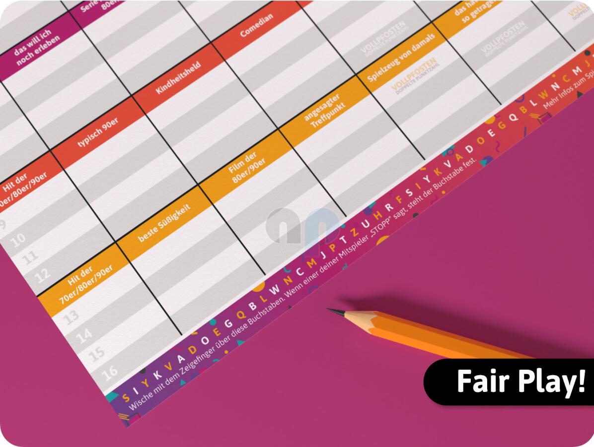 Die nostalgische Edition im DIN A4-Format mit 50 Blatt des Kultspiels STADT LAND VOLLPFOSTEN rund ums Thema 70er, 80er und 90er. Der ultimative Spielblock beinhaltet 30 spannende und vielfältige Kategorien für eine unvergessliche Stunden mit alten Freunden und Familie. Bringt garantiert jeden in Kindheit und Jugend zurück! Das Spiel fördert Wissen und Kreativität? Abwechslung garantiert: Die 70er, 80er und 90er EDITION beinhaltet eine spannende Vielfalt mit 30 verschiedenen Kategorien. Kategorienvorschau: TYPISCH 80er - EREIGNIS VOR 2000 - KULTGEGENSTAND - SPIELZEUG VON DAMALS - KINDHEITSHELD - ANGESAGTER TREFFPUNKT - DAS WILL ICH NOCH ERLEBEN - TYPSCH 70er - FILM DER 80er/90er - JUNGENDSÜNDE - DAS GAB ES DAMALS NOCH NICHT - HIT DER 70er/80er/90er - DAS WAR REVOLUTIONÄR Innovative Buchstabenleiste gegen Schummler: Wische einfach mit dem Zeigefinger über die Buchstabenleiste. Wenn einer deiner Mitspieler «STOPP» sagt, steht der Buchstabe fest, mit dem gespielt werden muss. 50 Blatt purer Spielspass Dieser ultimative Spielblock im DIN A4 Format beinhaltet 50 Blatt. So ist für viele ausgiebige Spieleabende für Grillfans, Freunde oder Familie gesorgt. Perfekt zum Verschenken oder beim Grillfest. Altersempfehlung: ab 12 Jahren Spielablauf und Punkteverteilung: Jeder Spieler erhält eine Seite des DIN-A4 Blockes und legt diese vor sich hin. Es wird eine Zeit pro Durchgang ausgemacht (wir empfehlen 2 Minuten als Begrenzung). Die innovative Buchstabenleiste hilft bei der Ermittlung des Buchstabens. Dann gilt es so schnell wie möglich alle Begriffe einzutragen. Pro Runde sind 8 Begriffe gesucht Punkteverteilung: Dir fällt kein richtiges Wort ein = 0 Punkte Mindestens ein Mitspieler hat dasselbe Wort wie du = 5 Punkte Kein Mitspieler hat dasselbe Wort wie du = 10 Punkte Dir ist als Einziger ein Wort in der Kategorie eingefallen = 20 Punkte Ausserdem gibt es sogenannte VOLLPFOSTEN-Felder bei denen man stets die doppelte Punktzahl erhält.