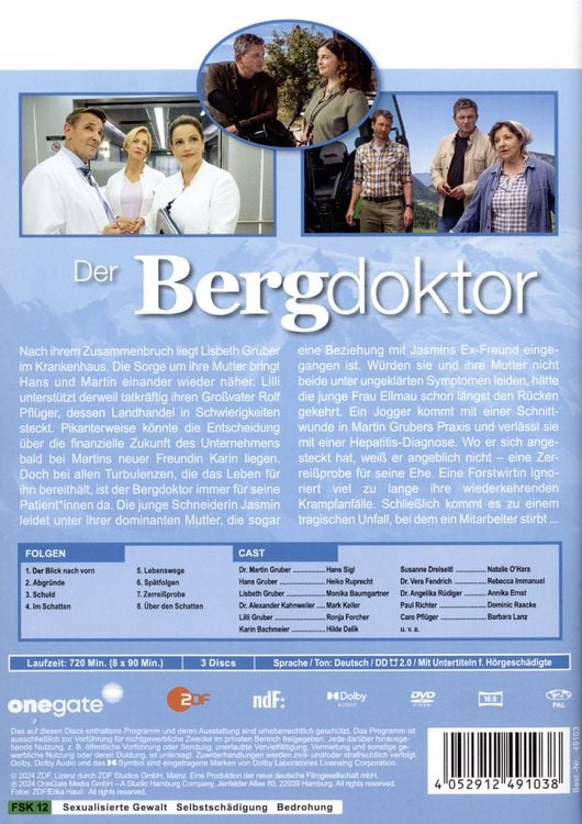 Bei den Grubers wird es friedlicher Mama Gruber liegt auf der Normalstation, will aber nicht, dass sich ihr Sohn in die Behandlung einmischt Martin und Hans reden immerhin wieder miteinander Auch wenn Martin weiterhin nicht mehr auf dem Hof wohnt, bietet er Hans an, ihm bei der landwirtschaftlichen Arbeit zu helfen Seine Reise nach New York hat Martin bis auf weiteres verschoben Aber nicht nur privat bleibt es beim Bergdoktor turbulent, auch seine Patienten stellen ihn ständig vor Herausforderungen DVD 1 1 Der Blick nach vorn 2 Abgründe DVD 2 3 Schuld 4 Im Schatten 5 Lebenswege DVD 3 6 Spätfolgen 7 Zerreißprobe 8