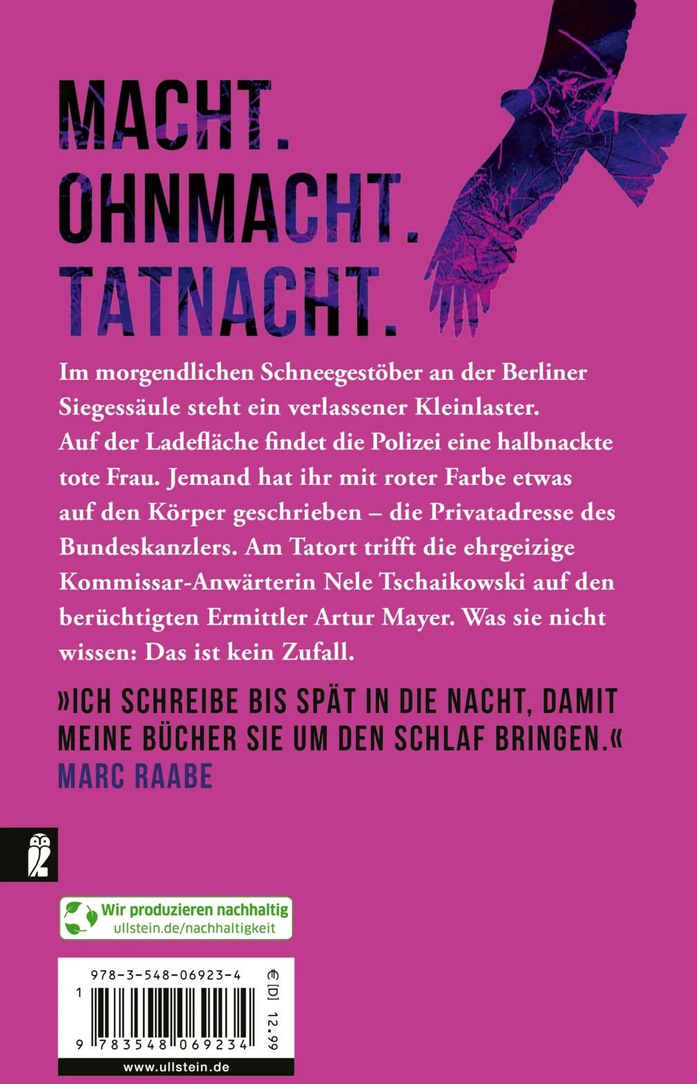 Macht. Ohnmacht. Tatnacht.Im morgendlichen Schneegestöber an der Berliner Siegessäule steht ein verlassener Kleinlaster. Auf der Ladefläche findet die Polizei eine halbnackte tote Frau. Jemand hat ihr mit roter Farbe etwas auf den Körper geschrieben - die Privatadresse des Bundeskanzlers. Am Tatort trifft die ehrgeizige Kommissar-Anwärterin Nele Tschaikowski auf den berüchtigten Ermittler Artur Mayer. Was sie nicht wissen: Das ist kein Zufall.