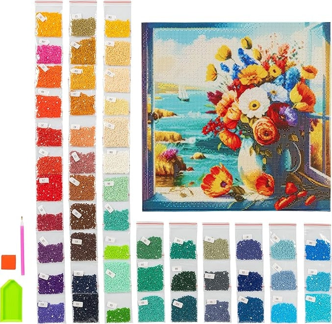 Das Gestalten des Bildes macht Spass und entspannt - ein toller Zeitvertreib! Im Set ist alles enthalten, um direkt loszulegen. Während des Aufklebens der bunten „Diamanten" können Sie vom Alltag eine Pause einlegen und abschalten. Und wenn das Diamond Painting „Bouquet“ fertig gestellt ist, ergibt sich ein wunderbarer Blickfang der zum Träumen einlädt: Ein üppig mit bunten Sommerblumen bestückter Krug, der am geöffneten Fenster steht. Der Blick aus dem Fenster reicht die Meeresküste entlang. Im Hintergrund nähert sich ein Segelboot im Wind…