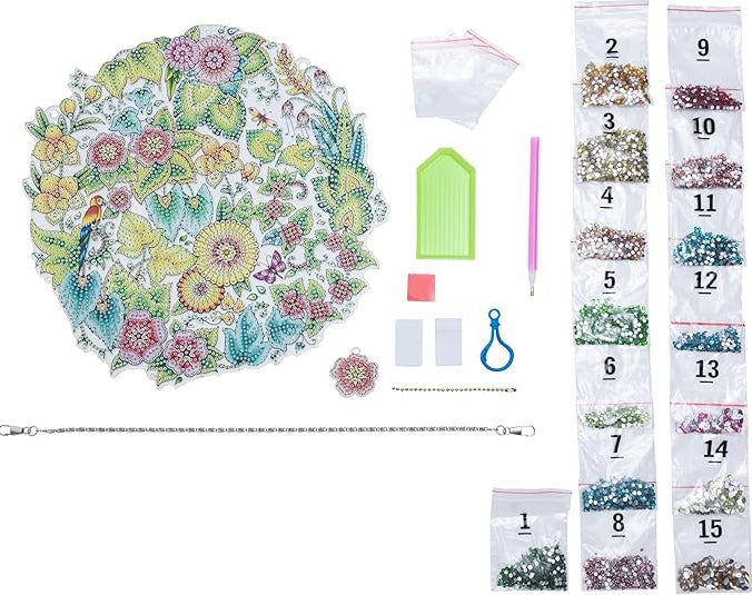 Erst gibt es was zu basteln, dann eine tolle Deko! Steinchen für Steinchen entsteht hier ein funkelnder Dekokranz zum Aufhängen: ein üppiger, fast schon tropisch anmutender Blumenschmuck, der nicht vergeht. In leuchtenden Farben erblühen und ranken hier grosse und kleine Blüten und Blätter, dass es eine Freude ist! Zwischen dem Blattwerk tummeln sich noch kleine Schmetterlinge und sogar ein Papagei.