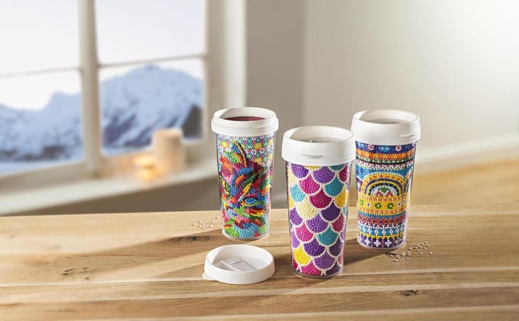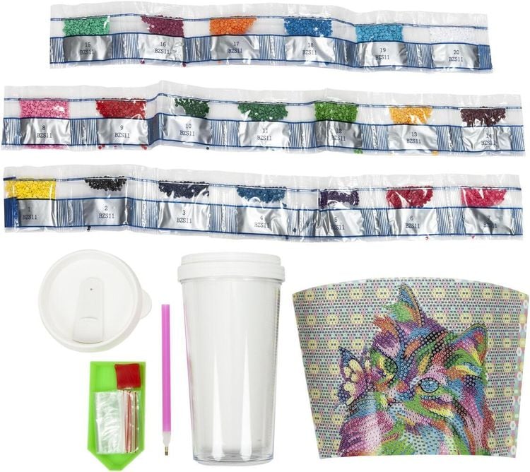 Komplett-Bastelset Zum Gestalten eines To-go-Bechers Mit bunter Diamond-Painting Katze Mit Deckel - ideal für unterwegs Fassungsvermögen 470 ml Kreieren Sie sich einen einzigartigen To-go-Becher: mit dem Diamond Painting DIY Bastelset Kaffeebecher "Bunte Katze" Das Basteln dieses kunterbunten Kätzchen-Bechers mit Diamond Painting ist gelingt ganz leicht. Einfach die Banderole mit den farblich sortierten Kunststeinchen bestücken. Dafür reichern Sie zunächst den Applizierstift mit etwas Wachskleber an - so haften die einzelnen Diamonds daran und lassen sich punktgenau auf die markierten Felder setzen. Stein für Stein vervollständigt sich so das bunte Bild mit der Katze. Alle Materialen, die Sie benötigen, sind im Set enthalten. Die komplett mit Diamonds bestückte Banderole wird nun um den Becher geklebt und dieser dann in einen transparente Schutzhülle gesteckt. So ist Ihr Becher noch stabiler und geschützt. Der fertig gestaltete Becher ist auch ein tolles Geschenk! Diamond Painting DIY Bastelset Kaffeebecher "Bunte Katze": Maße: Höhe 18,5 cm, Ø 9,5 cm inkl. farblich sortierten Kunststeinchen, Applizierstift, Wachskleber, Schälchen zum Aufnehmen der Steinchen Becher nicht spülmschinengeeignet; bitte von Hand spülen mit Deckel (nicht auslaufsicher) Gleich bestellen: den außergewöhnlichen To-go-Becher mit Diamond Painting Katzen-Motiv!