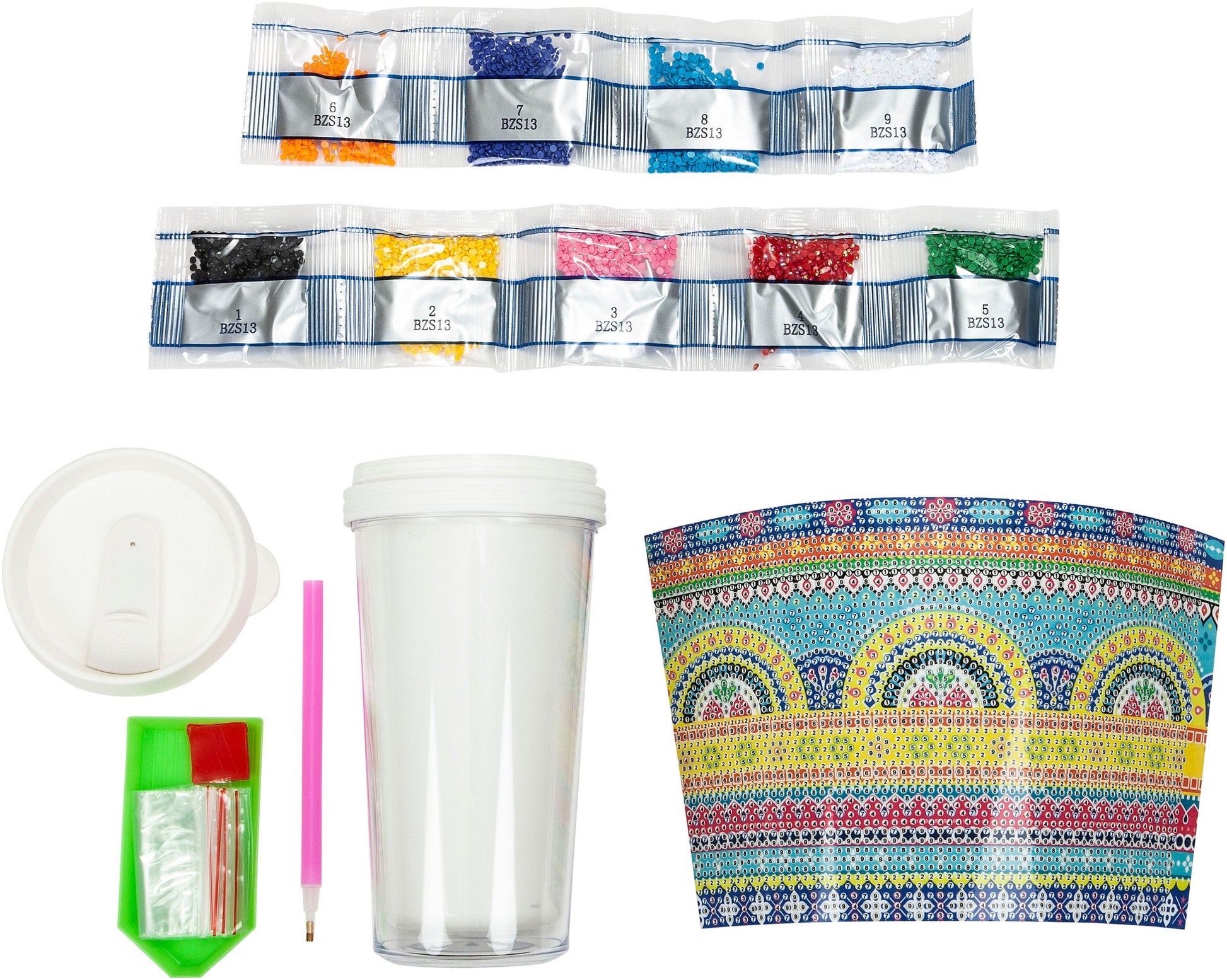 Das Basteln dieses kunterbunt gemusterten Bechers mit Diamond Painting ist gelingt ganz leicht. Einfach die Banderole mit den farblich sortierten Kunststeinchen bestücken. Dafür reichern Sie zunächst den Applizierstift mit etwas Wachskleber an - so haften die einzelnen Diamonds daran und lassen sich punktgenau auf die markierten Felder setzen. Stein für Stein vervollständigt sich so das bunte Muster im mexikanischen Stil. Alle Materialen, die Sie benötigen, sind im Set enthalten.