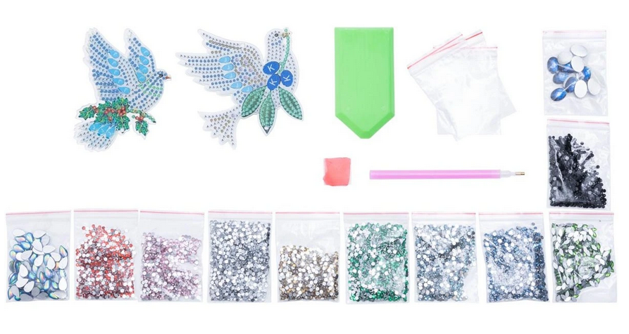 Dieses komplette Set ist sehr einfach zu machen und ermöglicht es Ihnen, sofort zu erstellen. Jede Taube hat eine glitzernde Feder, die durch Diamantmalerei entsteht. Stein durch Stein und trägt einen Zweig im Schnabel oder in den Krallen.