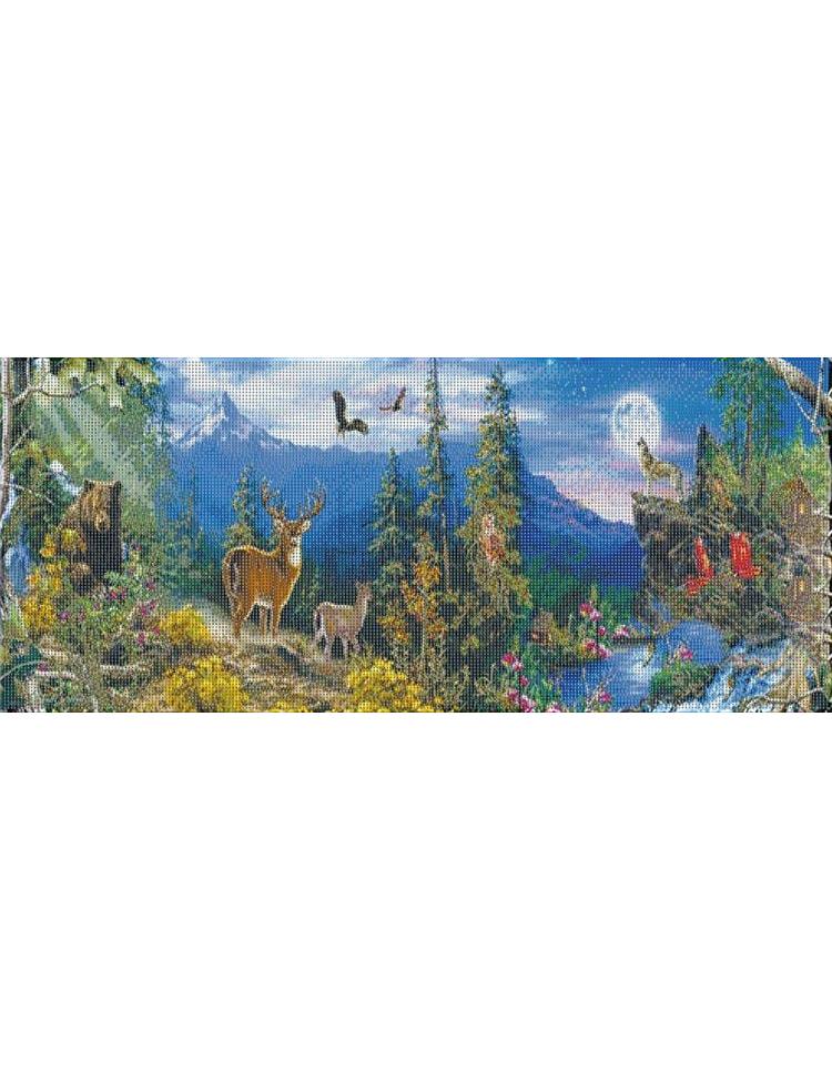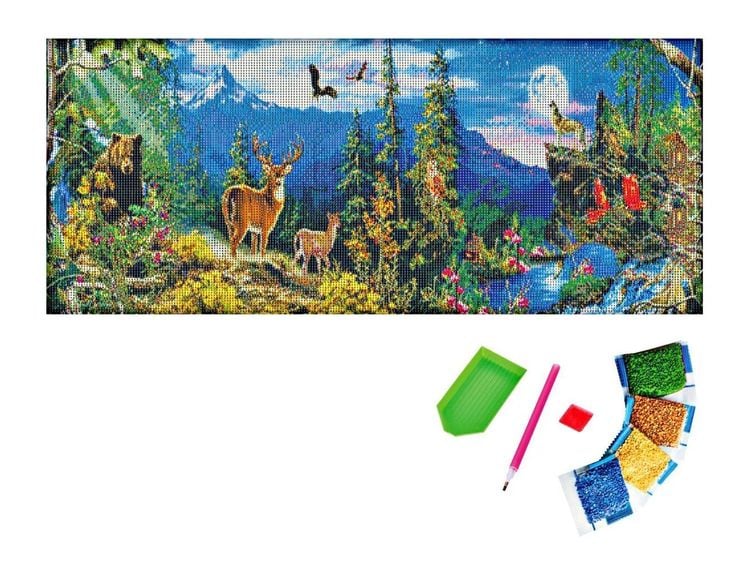 Zauberhaftes Kunstwerk zum selbst Kreieren Im Panorama-Format von 80 x 30 cm! Kreativ und meditativ Inkl. Keilrahmen: fix und fertig zum Aufhängen Diamond-Painting: Zaubern Sie ein funkelndes Kunstwerk aus bunten Steinchen Lassen Sie die Diamanten funkeln! Diamond Paintings werden aus farbigen Kunststeinchen "gemalt". Jeder Stein wird auf ein bestimmtes Feld gesetzt - ähnlich dem Prinzip Malen nach Zahlen. Mit dem Spezialstift lässt sich jedes Steinchen ganz präzise auf den selbstklebenden Zahlenfeldern applizieren. Seine Spitze wird mit etwas Wachskleber angereichert - so können die einzelnen Steinchen daran haften und lassen sich sauber platzieren. Stein für Stein entsteht so ein ganz besonders lebendig und plastisch wirkendes glitzerndes Bild im Panoramaformat: Vor einem mächtigen Bergpanorama zeigt sich eine herrliche Waldszenerie. Ein großer Braunbär schaut aus den Bäumen hervor und ein mächtiger Hirsch blickt steht mit gespitzten Ohren auf der Lichtung. Im Hintergrund heult ein Wolf den Vollmond an. Auch Greifvögel und eine Eule gibt es in der märchenhaft anmutenden Landschaft zu entdecken Das Fertigen des Diamond-Paintings ist ganz einfach und beim Aufkleben der "Diamanten" gerät der stressige Alltag ein Stück in Vergessenheit - herrlich entspannend und wohltuend. Das fertige Panorama der "Waldszene" ist auch als Geschenk gut geeignet! Diamond Painting-Set "Waldszene": Leinwand mit Holzrahmen, 80 x 30 cm Spezialstift Wachskleber Schiffchen farblich sortierte Diamond-Steinchen Legen Sie das Diamond Painting mit dem Motiv der "Waldszene" gleich in Ihren Warenkorb - und genießen Sie die kreative Auszeit!