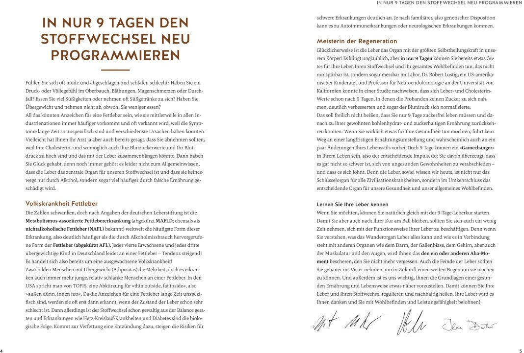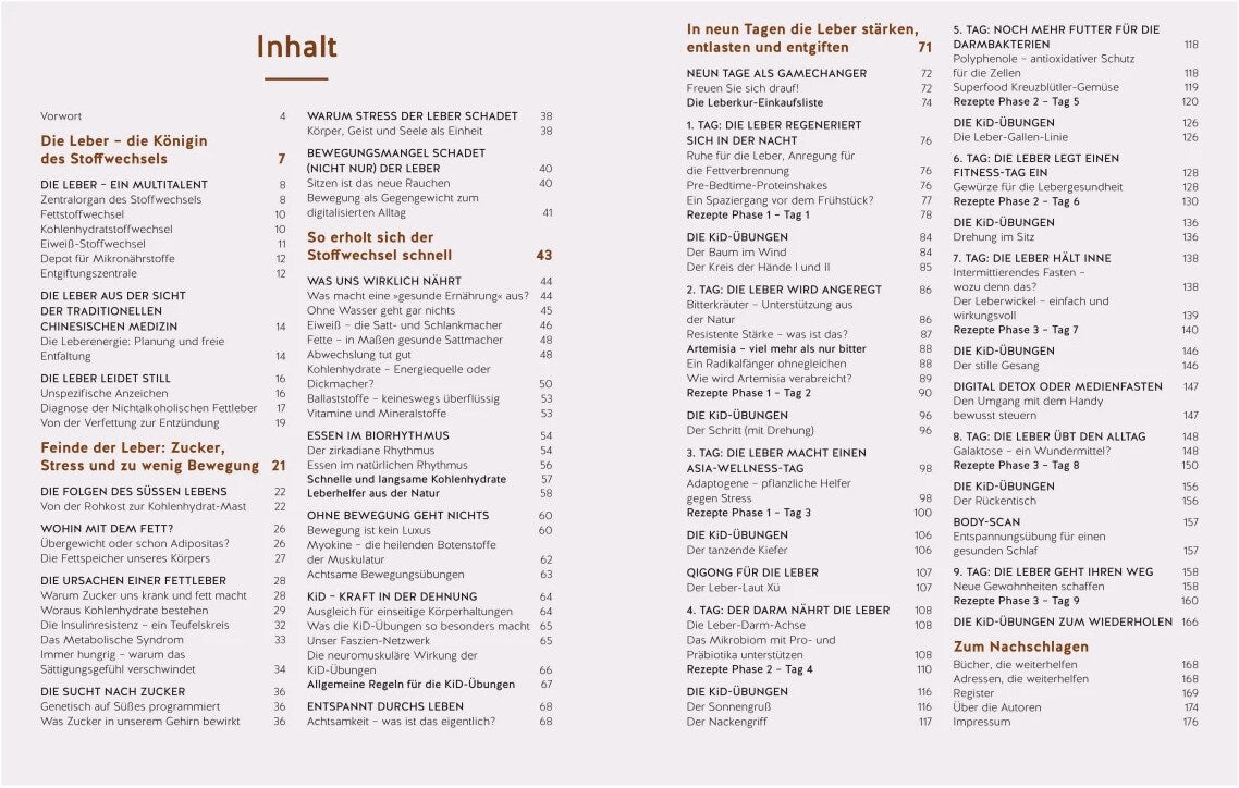 Superorgan Leber - die Schaltzentrale unserer GesundheitDie Leber ist unser wichtigstes Stoffwechselorgan und in einem hohen Mass verantwortlich für unsere Gesundheit. Die schlechte Nachricht: Immer mehr Menschen erfahren eine chronische Lebererkrankung. Hauptursachen sind eine falsche Ernährung, zu viel Stress und mangelnde Bewegung. Die gute Nachricht: Die Leber kann sich sehr schnell erholen. Aktuelle Studien aus den USA belegen, dass schon nach 9 Tagen ohne Zucker sich die Leberwerte signifikant verbessern. Im Zentrum dieser 9-Tage-Kur steht eine Ernährung, die sehr schmackhaft ist und bei der auf kurzkettige Kohlenhydrate und vor allem auf Fruktose verzichtet wird. Unterstützt wird die Leberreinigung durch einfache Körperübungen, naturheilkundliche Mittel sowie Stressreduktion.