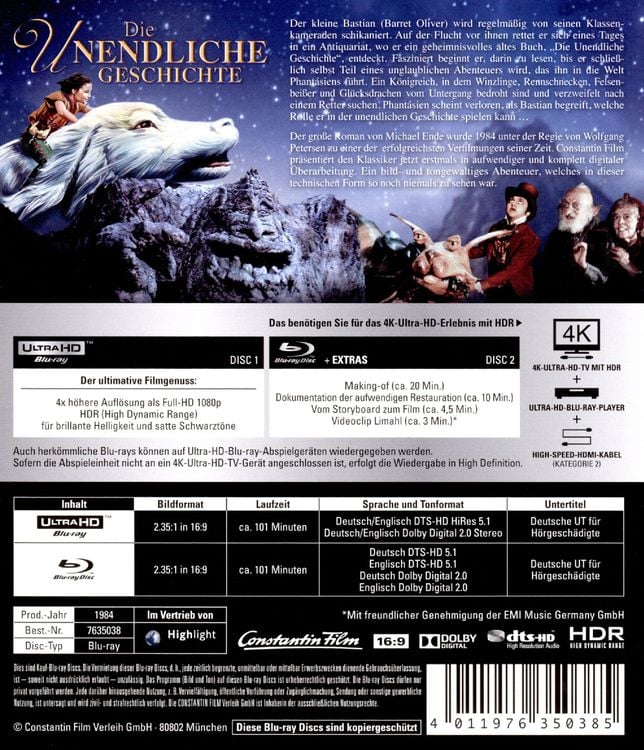 Der kleine Bastian (Barret Oliver) wird regelmäßig von seinen Klassenkameraden schikaniert. Auf der Flucht vor ihnen rettet er sich eines Tages in ein Antiquariat, wo er ein geheimnisvolles altes Buch, "Die Unendliche Geschichte", entdeckt. Fasziniert beginnt er darin zu lesen, bis er schließlich selbst Teil eines unglaublichen Abenteuers wird, das ihn in die Welt Phantasiens führt. Ein Königreich, in dem Winzlinge, Rennschnecken, Felsenbeißer und Glücksdrachen vom Untergang bedroht sind und verzweifelt nach einem Retter suchen. Phantasien scheint verloren, als Bastian begreift, welche Rolle er in der unendlichen Geschichte spielen kann … Der große Roman von Michael Ende wurde 1984 unter der Regie von Wolfgang Petersen zu einer der erfolgreichsten Verfilmungen seiner Zeit.
