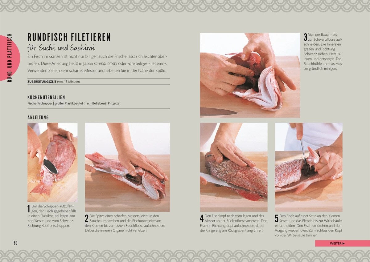 Zum Einstieg zeigen Ihnen die beiden erfahrenen Sushi-Experten Kimiko Barber und Hiroki Takemura die Basics über Warenkunde, Werkzeuge und Küchentechniken. Anschließend erfahren Sie in anschaulichen Stepbildern, wie Sie verschiedene Sushi wie Chirashi, Oshi, Inari, Maki und Nigiri selbst herstellen - egal ob gewickelt, gerollt oder in der Schale serviert.