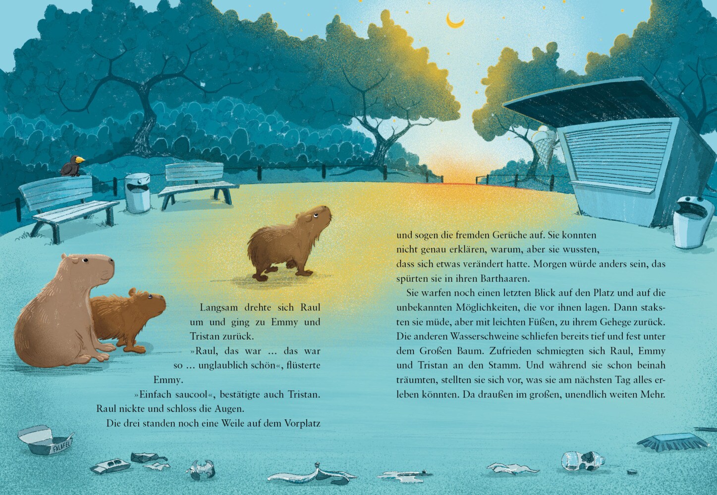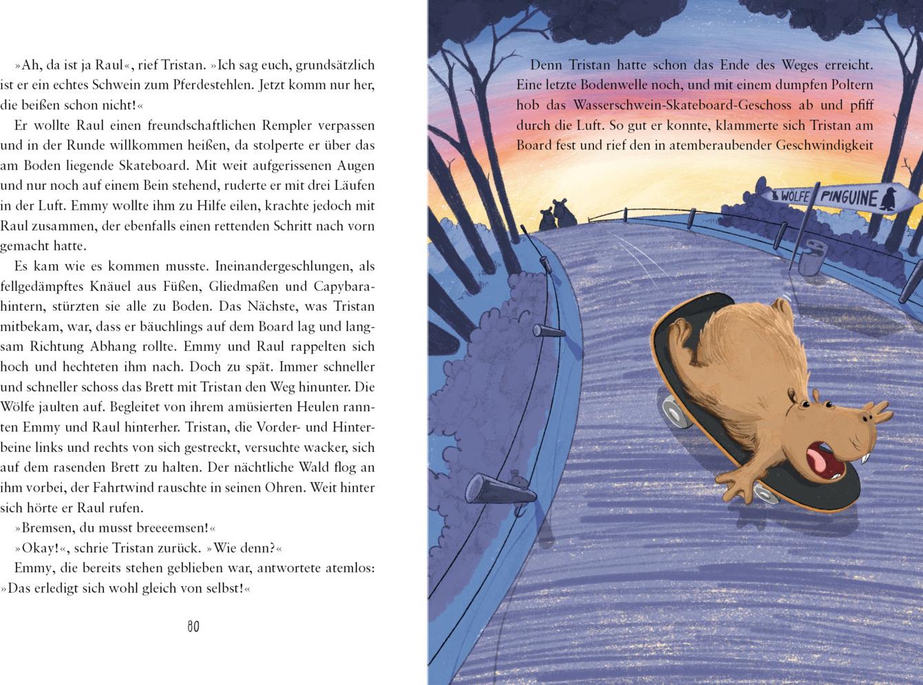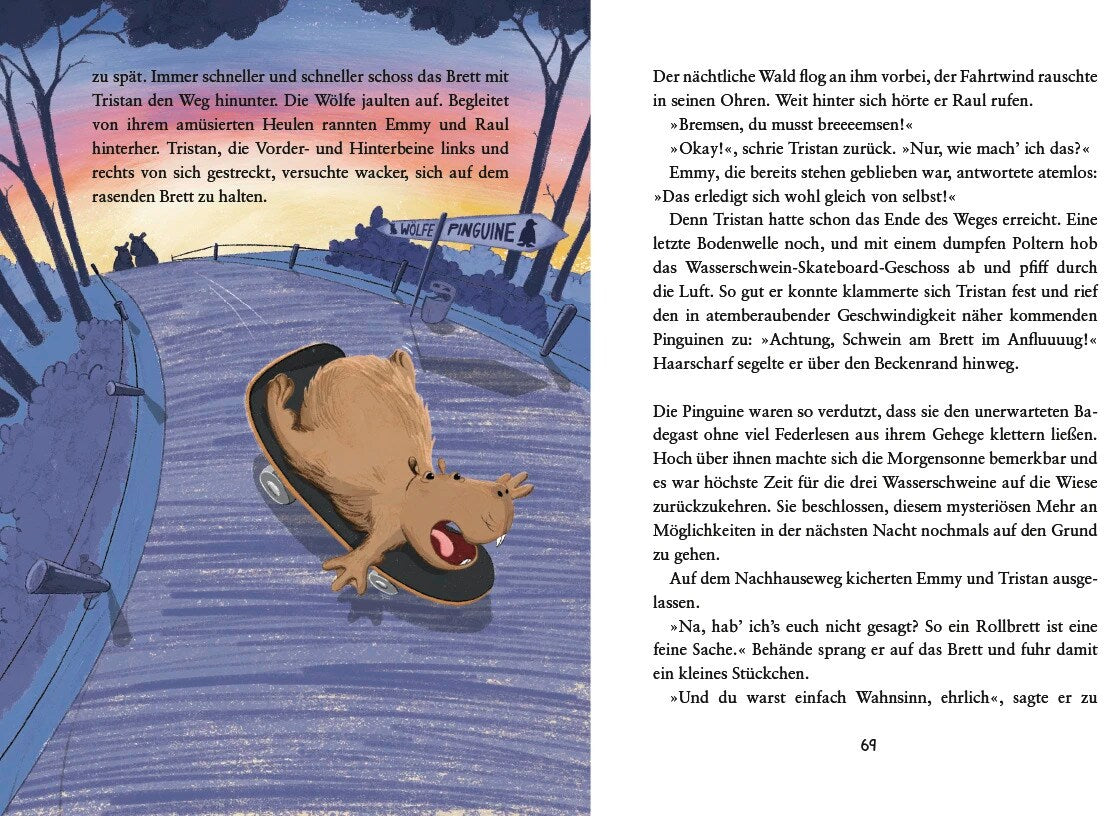 Die Wasserschweine sind los!Die drei kleinen Wasserschweine Emmy, Tristan und Raul sind gute Freunde und leben zusammen mit ihrer Herde auf einer Wiese im Zoo. Die drei Freunde fragen sich, ob es ausserhalb ihres Geheges mehr gibt, als sie zu sehen im Stande sind und was wohl hinter dem Zaun liegen könnte. Mit Mut, Geschick und etwas Glück gelingt es ihnen, die Absperrung zu überwinden und so das »Mehr« und die Welt um sie herum zu erkunden. Auf ihren nächtlichen Ausflügen lernen sie die benachbarten Tiere kennen und erleben spannende und lustige Abenteuer.