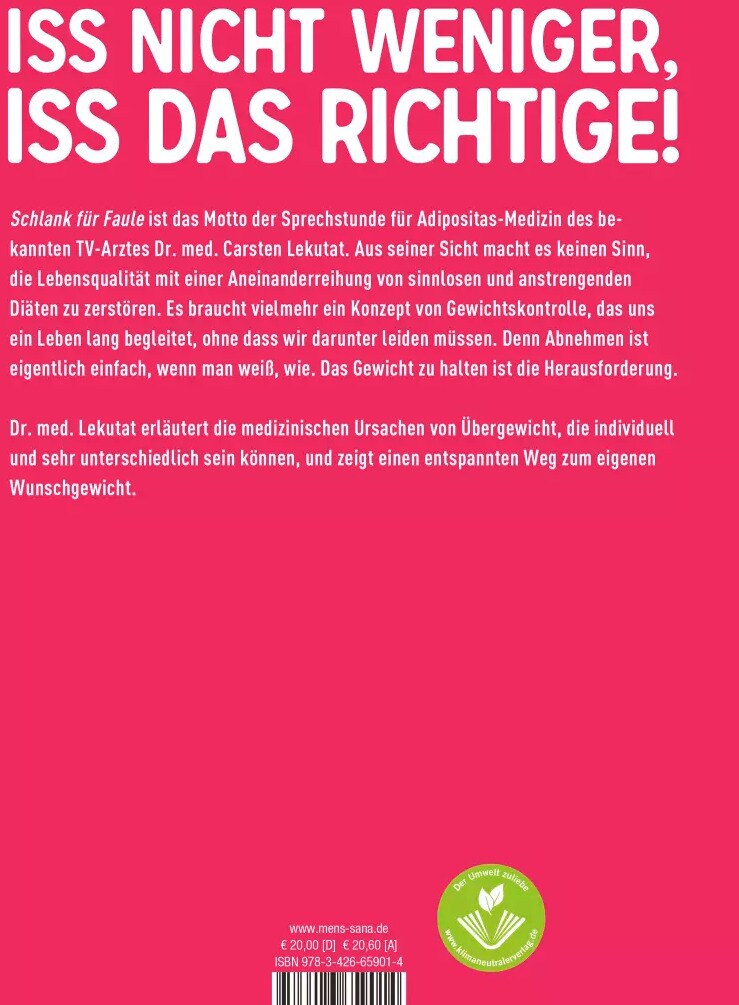 "Ich weiß, wie Sie sich fühlen: Ich hatte auch einige Kilos zu viel auf der Waage. Ganze 23 Kilogramm trennten mich von meinem Wunschgewicht! Aber ich habe sie verloren - dauerhaft. Und das ohne Diäten und ohne Qualen. Und wenn Sie jetzt glauben, das ist wieder so ein weiterer Diät-Ratgeber, dann liegen Sie falsch. Denn Diäten sind das Falscheste, was Sie machen können, wenn Sie Gewicht verlieren und danach dauerhaft schlank bleiben wollen." Dr. med. Carsten Lekutat
