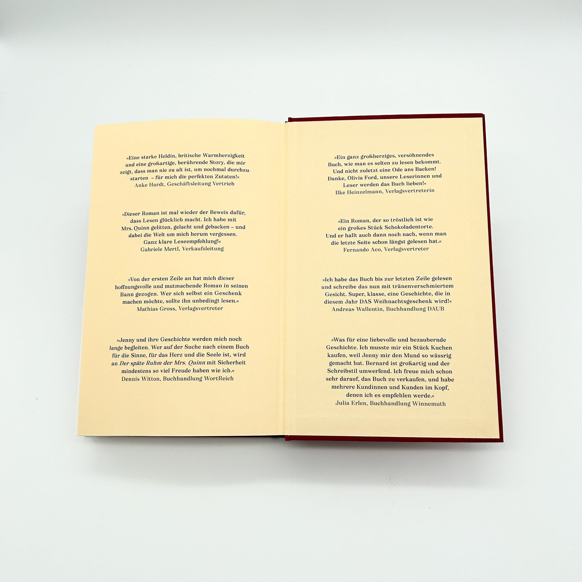 »Mrs. Quinn spürt ein Kribbeln, als läge in diesem Jahr etwas Besonderes über allem.« Jennifer Quinn hätte nie gedacht, dass in ihrem Leben noch etwas Aufregendes passiert. Seit fast sechzig Jahren ist sie glücklich mit Bernard verheiratet, und die beiden genießen ihre beschaulichen Tage in einem kleinen englischen Dorf. Mrs. Quinns Leidenschaft ist das Backen, die vielen Familienrezepte gehören zu ihren wertvollsten Erinnerungen, und sie liebt es, Freunde und Familie mit ihren Köstlichkeiten zu verwöhnen. Doch kurz vor dem großen Hochzeitstag mit Bernard ist auf einmal alles anders.»Mit einem Mal war sie sich der Dringlichkeit ihrer schwindenden Existenz mehr als bewusst. Der Tatsache, dass sie einen Punkt erreicht hatte, an dem der größte Teil ihres Lebens bereits hinter ihr lag.«Sie fühlt, dass sie noch etwas wagen muss, bevor es zu spät ist. Heimlich bewirbt sie sich für eine beliebte TV-Backshow und erfüllt sich dadurch nicht nur einen großen Traum, sondern setzt auch alles aufs Spiel. Denn was niemand ahnt: In Mrs. Quinns Leben gibt es ein dunkles Geheimnis, das sie jahrzehntelang gut gehütet glaubte, und dem sie sich nun endlich stellen [...] bewegender Roman über eine lebenslange Liebe, das Älterwerden und den Mut, etwas Neues zu wagen. Ein Wohlfühlbuch für das Herz, die Sinne und die Seele.»Perfekt zubereitet, köstlich und wohltuend. Mrs. Quinn wird alle bezaubern.« CLARE POOLEY, Autorin von >Montags bei Monica<