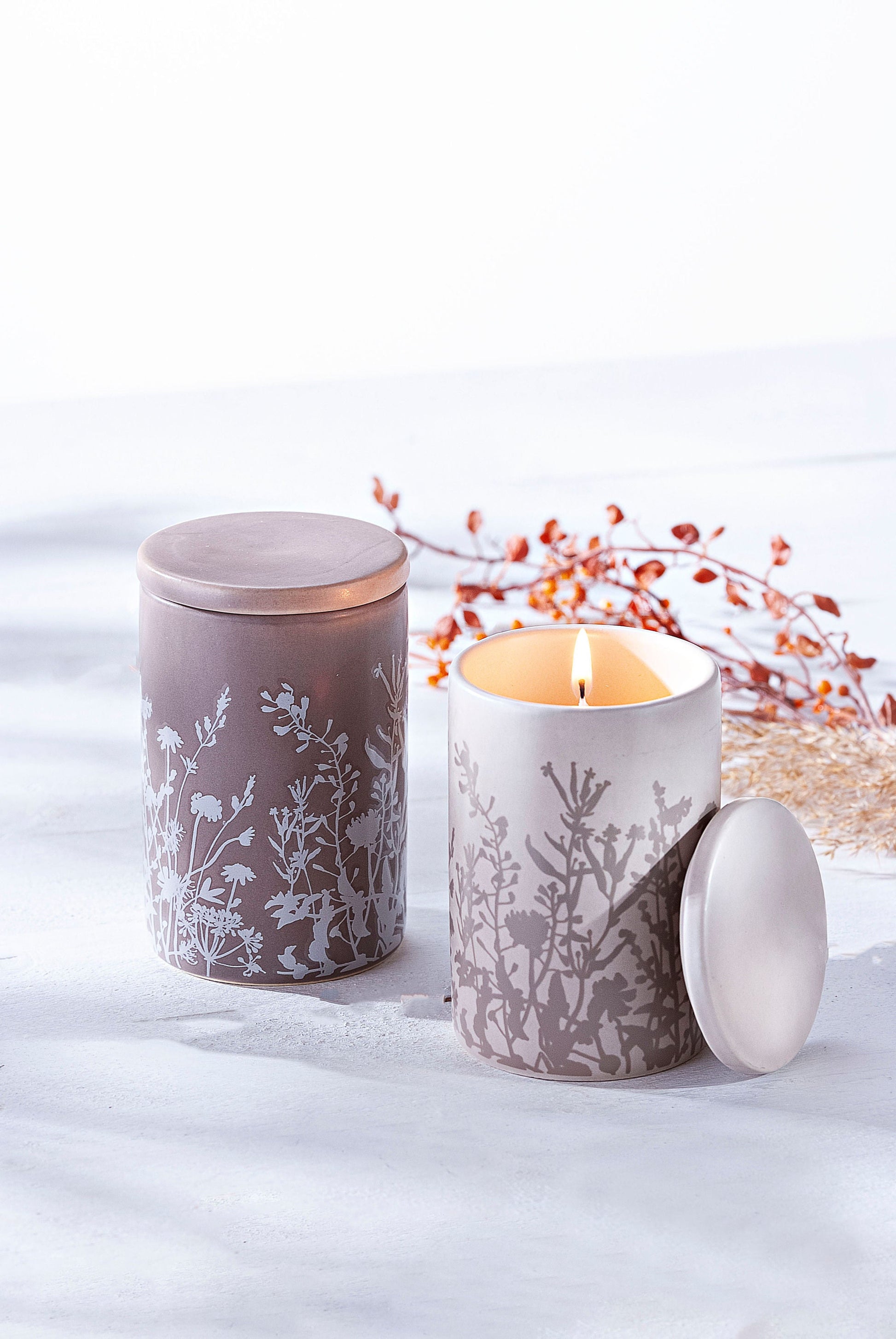 Stilvoll relaxen und angenehmen Duft im Kerzenschein genießen: Mit diesem 2er-Set Duftkerzen in dekorativen Keramiktöpfchen zieht gleich entspannte Stimmung in Ihr Zuhause ein. In zwei aufeinander abgestimmten Farbtönen, trendigem Greige und Beige, und mit romantischem unifarbenem Blumendekor verziert sind die Keramikgefäße ein eleganter Blickfang, der überall dekorativ zur Geltung kommt: Auf Tisch oder Fensterbank, am Sideboard Regal, auf dem Nachttisch, im Bad … Wenn Sie die Kerzen anzünden, wird Sie nicht nur der zarte Lichtschein verzaubern, sondern auch die wunderbaren Duftnoten: Mit 1 x entspanntem Cotton und 1 x sinnlichem Sandelholz haben Sie immer die richtige Duftnote für Ihre Stimmung parat und zaubern im Nu eine romantische Atmosphäre. Das cremefarbene Duftwachs ist in die beiden Keramikbecher eingegossen, durch die farblich passenden Deckel bleiben die Aromen länger bewahrt.