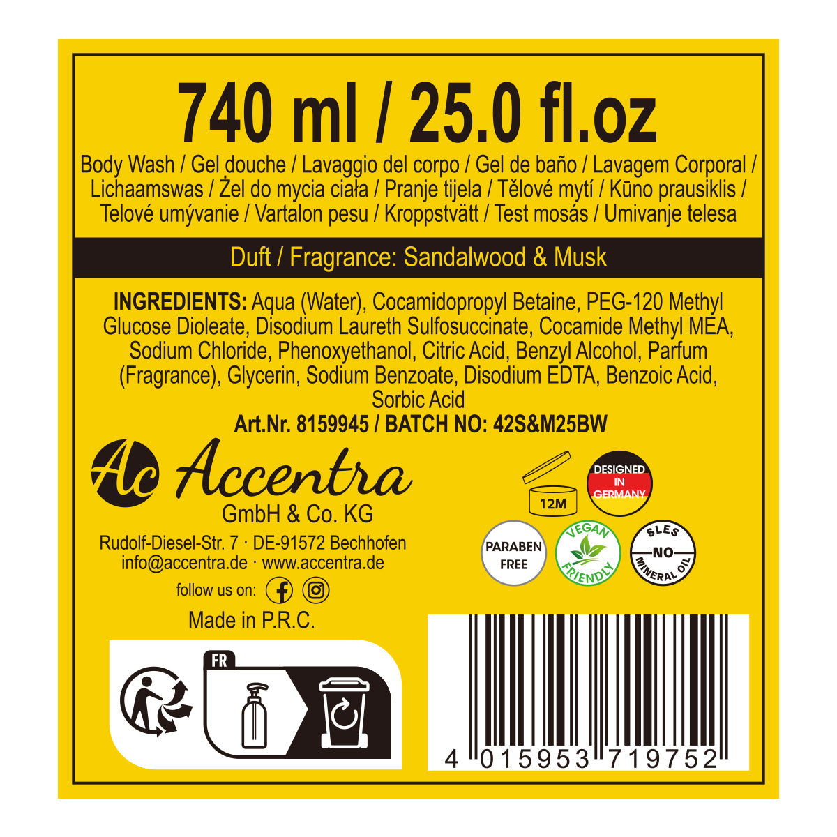 Entdecken Sie das Accentra Duschgel für Männer in praktischer Kanisterform! Mit einem grosszügigen Inhalt von 740 ml und einem XL Pumpspender ist es ideal für den täglichen Gebrauch. Der verführerische Duft von Sandelholz und Moschus sorgt für ein erfrischendes Duscherlebnis, das Ihre Sinne belebt und Ihnen ein Gefühl von Frische und Männlichkeit verleiht. Gönnen Sie sich die Pflege, die Sie verdienen, und verwandeln Sie Ihre Dusche in ein luxuriöses Ritual!