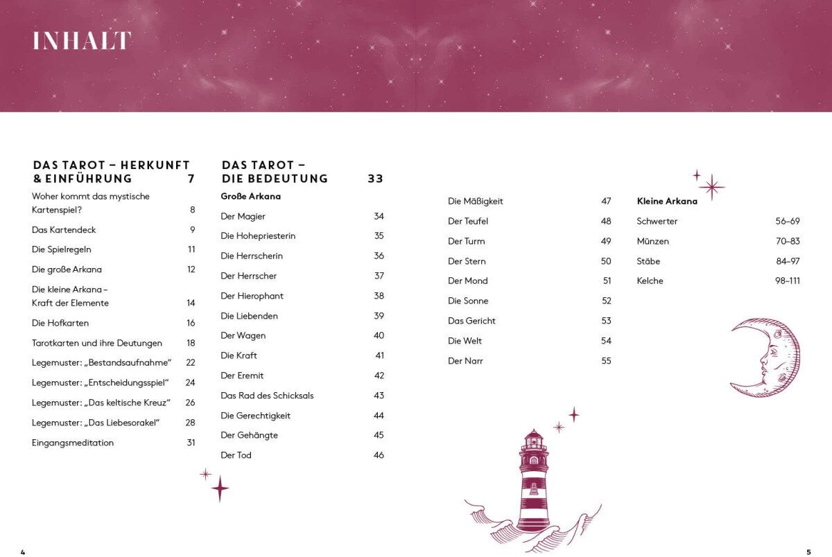 - ein begleitendes Handbuch, das die Legemuster erklärt und über die Deutung der Karten informiert