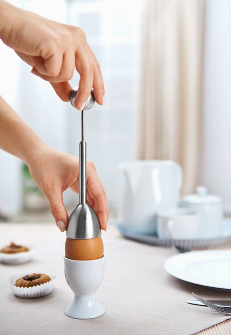 Der Schalenentferner ist ein einzigartiges Werkzeug für die Küche. Es ist ganz einfach. Einfach das Ei aufsetzen, den Griff anheben und loslassen. Die Schale bricht genau dort, wo es nötig ist, so dass das Schälen leichter fällt.