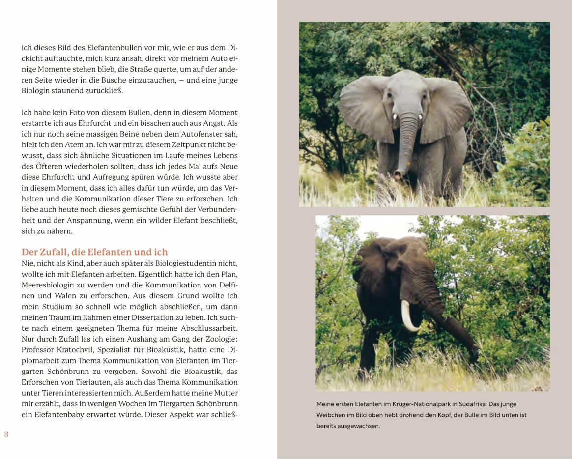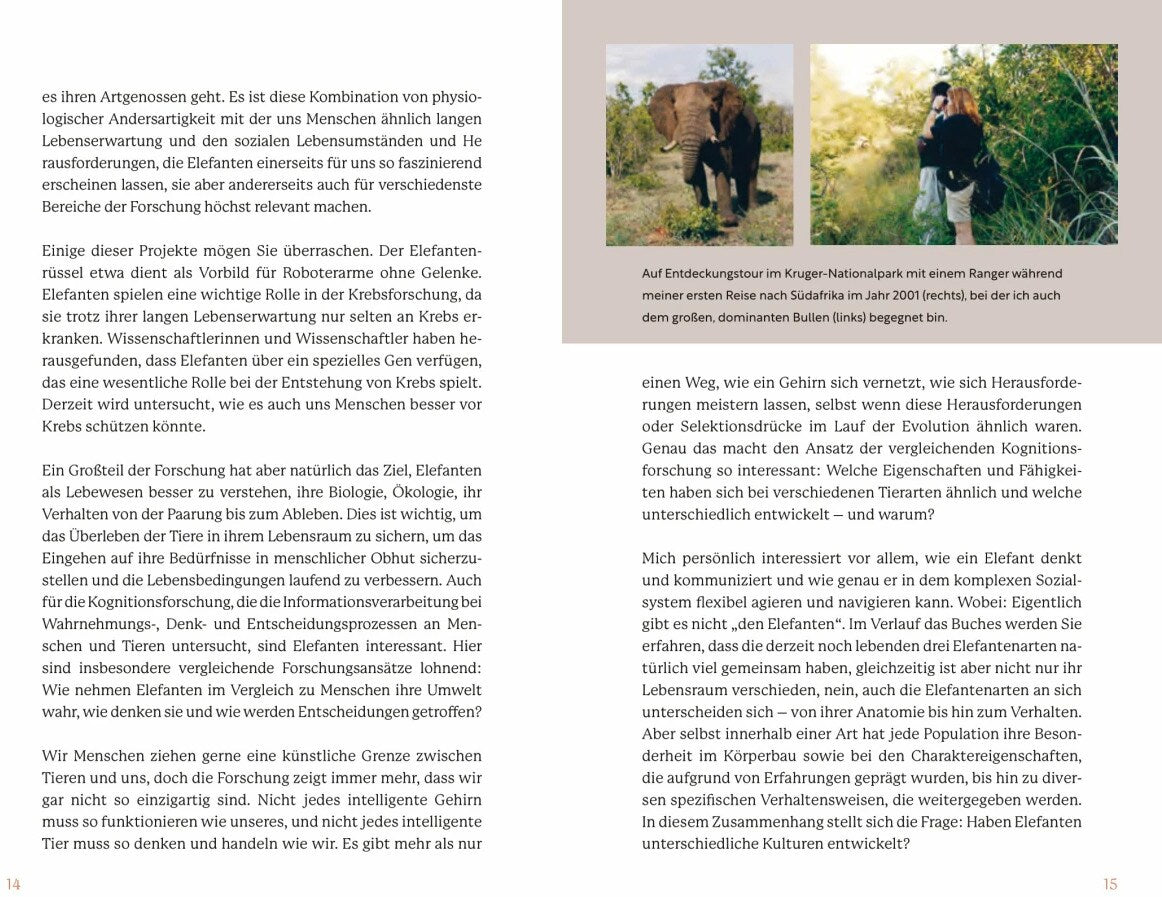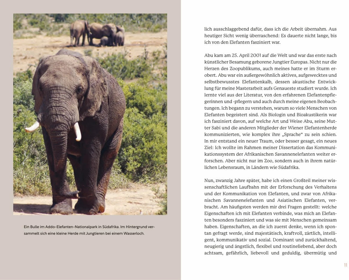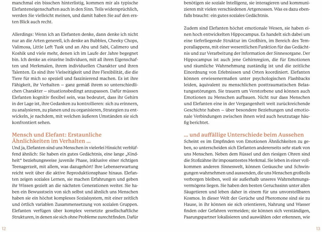Sie sind uns verblüffend ähnlich und doch so anders: Elefanten, die grössten noch lebenden Säugetiere der Erde, faszinieren uns aufgrund ihrer Intelligenz, ihrer Emotionen und ihres fürsorglichen Soziallebens. Die Fähigkeit, sich selbst im Spiegel zu erkennen, ihr sprichwörtliches Elefantengedächtnis, ihr Charisma, ihre individuellen Charaktere und Talente oder ihr Umgang mit Verstorbenen: Wir haben viel mehr mit ihnen gemein, als dass es der Körperbau der Elefanten vermuten liesse.Zugleich leben die Dickhäuter mit den grossen Ohren und riesigen Stosszähnen in einer vollkommen anderen Sinneswelt: Mit ihrem gigantischen Rüssel können sie nicht nur fühlen, sie haben auch den besten Geruchssinn unter allen Säugetieren. Geräusche und Schwingungen, die sie wahrnehmen und aussenden, bleiben uns Menschen grossteils verborgen.Die international renommierte Elefantenforscherin Angela Stöger nimmt uns mit auf ihre Entdeckungsreise in die erstaunliche Welt der Afrikanischen und Asiatischen Elefanten und der kaum bekannten Waldelefanten. Wir lernen Abu und Sabi, Bubbles, Valimosa, den Babyelefanten Mongu und viele andere Tiere kennen - und mit ihnen die Herausforderungen, denen sie sich stellen müssen: von zärtlichen Momenten untereinander bis hin zu ihren Kämpfen, ihrem Leben und ihrem Schicksal. Wir erfahren, wie sie kommunizieren, wie sie denken, wie sie fühlen. Dieses Buch hilft uns dank der neuesten wissenschaftlichen Erkenntnisse auch zu verstehen, wie wir ihre und unsere Intelligenz nutzen können, um das Überleben der Elefanten zu sichern.