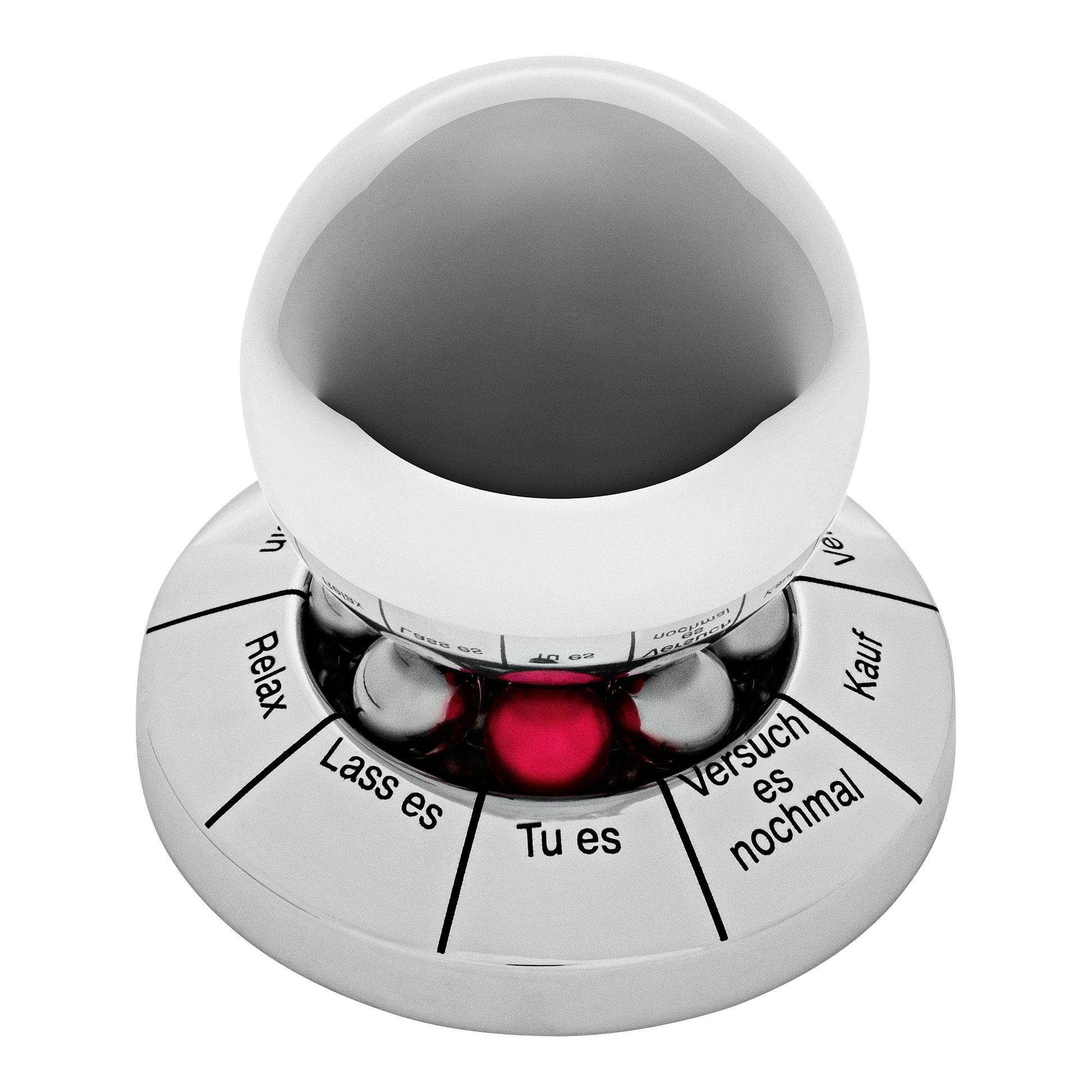 Für alle, die gerne mal länger mit sich ringen und so lange alles Für und Wider abwägen, dass sie sich völlig verkopfen: Mit dem Entscheidungshelfer können Sie Entscheidungsprozesse auf spielerische Weise beschleunigen. Einfach an der großen Kugel drehen - die rote Kugel sagt dan, was zu tun ist. 9 Aussagen sind möglich: "Lass es", "Kauf", "Relax", "Frag Mama", "Tu es", "Versuch es nochmal", "Frag Papa", "Jein", "Verkauf".