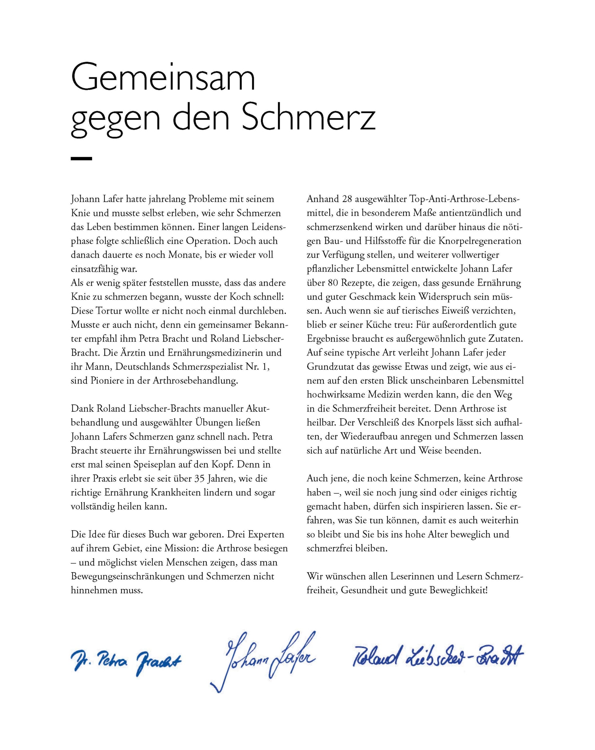 In seinem vielleicht persönlichsten Buch erzählt Johann Lafer im Schulterschluss mit den beiden Experten, wie es ihm gelang, seine Knieschmerzen loszuwerden. Verantwortlich dafu?r waren die Liebscher & Bracht-Behandlung und Übungen sowie die Ernährungsumstellung. Weg vom Fleisch, hin zum Gemu?se.