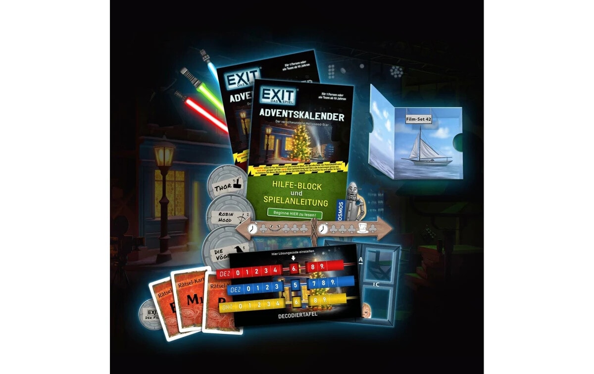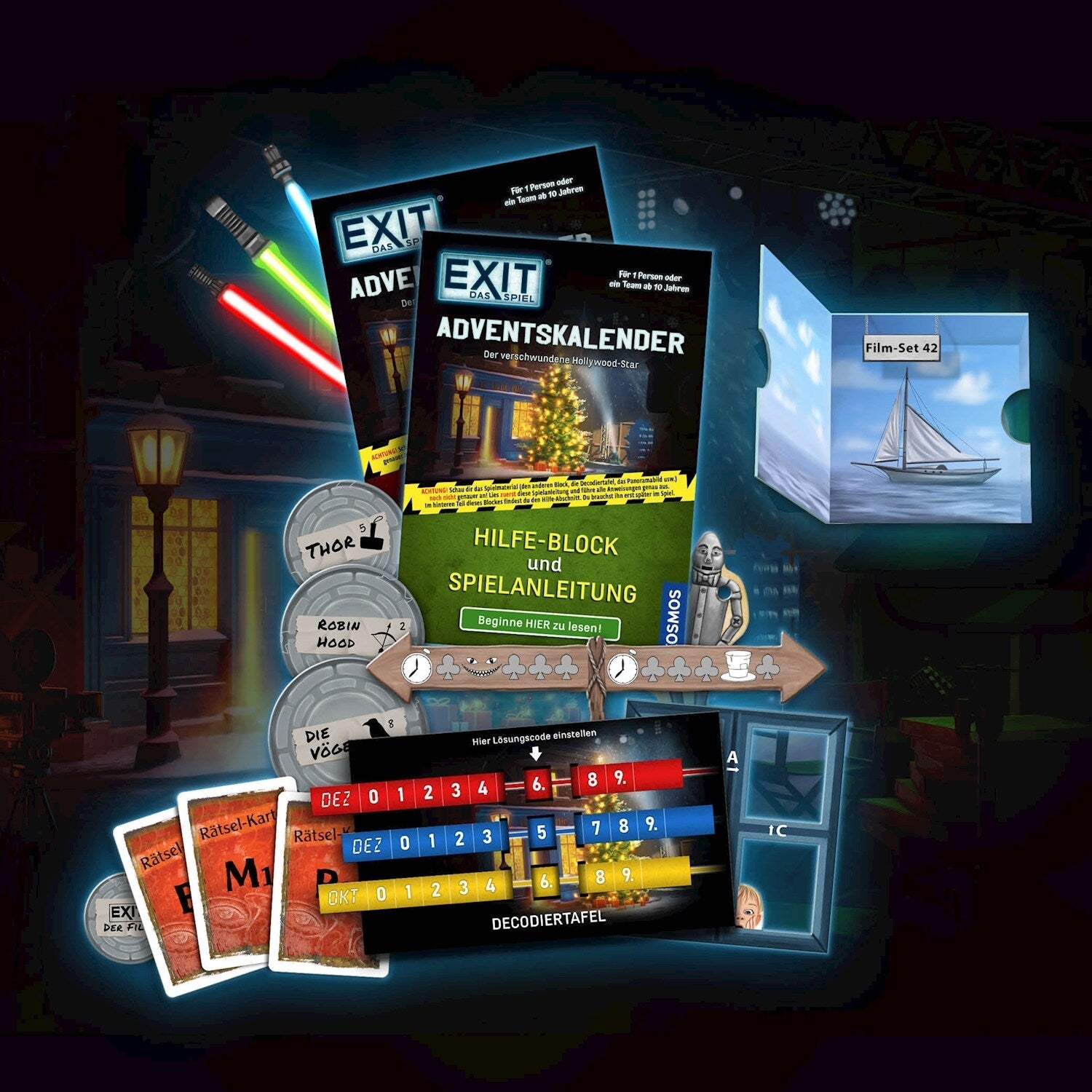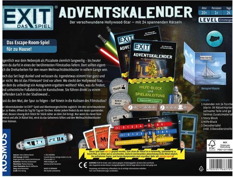 EXIT Das Spiel jetzt als Adventskalender. - Spannender Adventskalender für 24 Tage voller Rätsel. Level: Einsteiger. - Atmosphärische Abenteuergeschichte und cleveres Escape Game in einem. - Alleine oder gemeinsam im Team bis Weihnachten knobeln. Die Traumfabrik Hollywood ruft! Eher durch Zufall verschlägt es die Spielerinnen und Spieler in eines der grössten Filmstudios. Hier sollten eigentlich die Dreharbeiten für den neuen Weihnachtsblockbuster in vollem Gange sein. Doch das Set ist dunkel und verlassen. Wo ist das Filmteam? Und warum ist der Star des Films noch nicht aufgetaucht? Irgendetwas stimmt hier ganz und gar nicht. Um dem Geheimnis des Filmstudios auf die Spur zu kommen, muss Tag für Tag eines von 24 spannenden Rätseln gelöst werden. Wird es gelingen, den verschwundenen Star rechtzeitig zu finden? Inhalt: 1 Kalender mit 24 Türchen (darin: zahlreiche Rätsel-Karten, seltsame Teile und geheimes Zusatzmaterial), 1 Story-Block, 1 Hilfe-Block mit Spielanleitung, 1 Decodiertafel Der besondere Adventskalender für Erwachsene, Fans von Live Escape Rooms und Familien mit Kindern ab 10 Jahren.