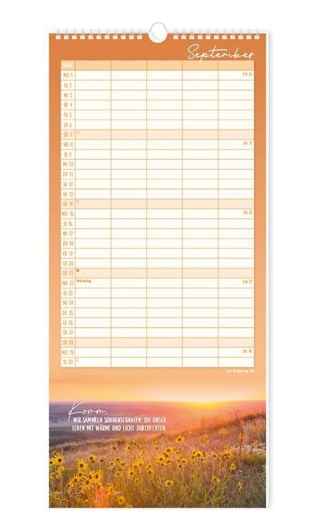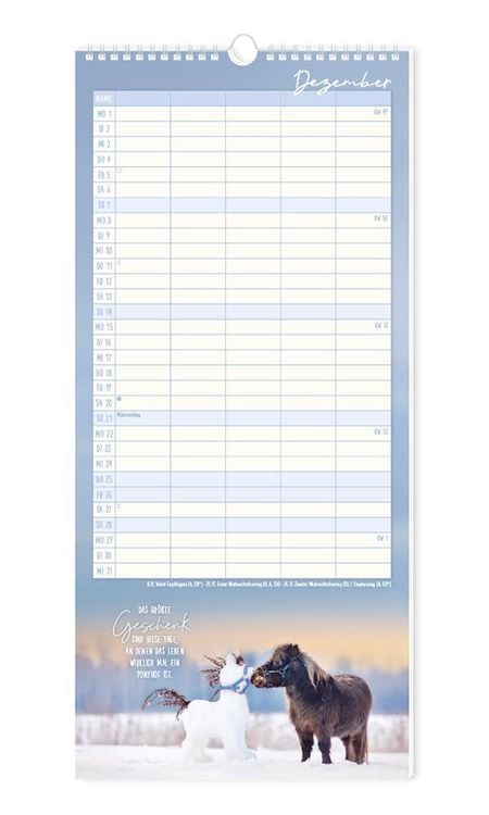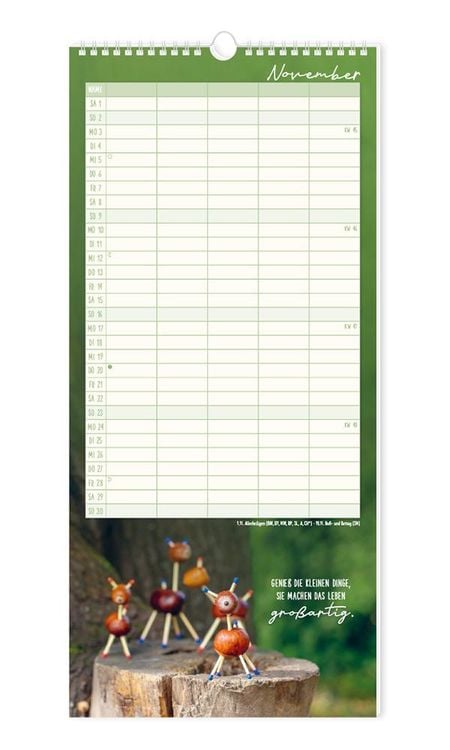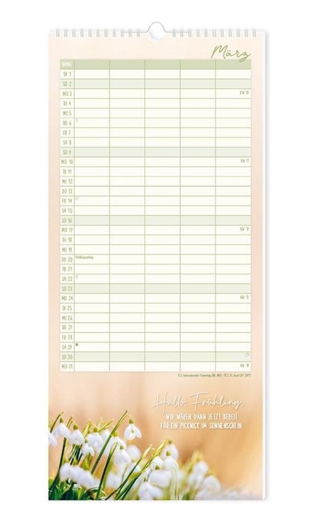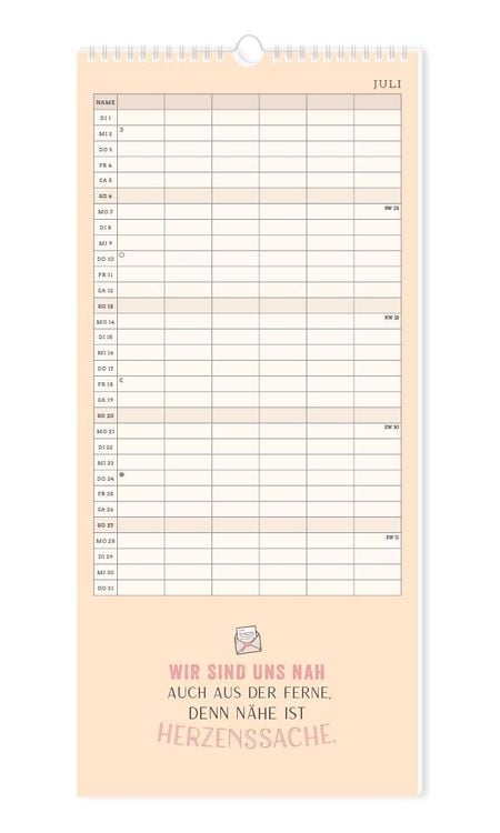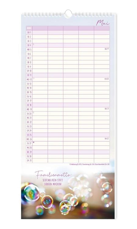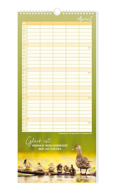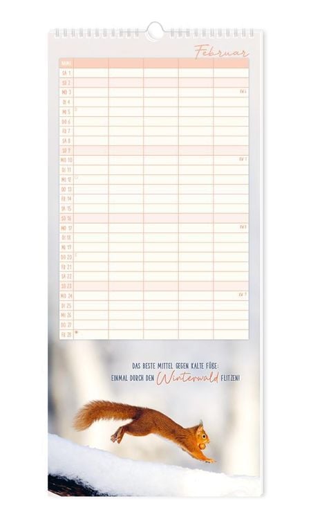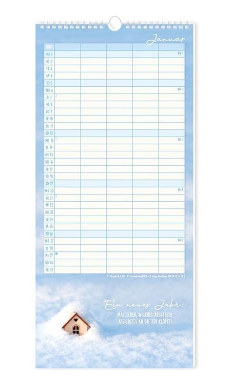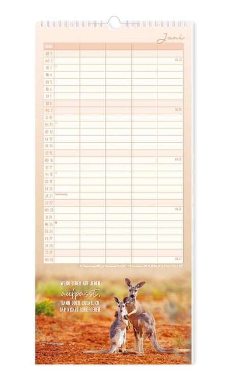 Großer Familienplaner 2025 für mehr Struktur im Alltag Dieser Familienplaner ist der perfekte Jahresplaner für bis zu 5 Personen. Ein Monat auf einer Seite und 5 extra große Spalten sorgen für den perfekten Überblick und leiten die ganze Familie durch den Alltag. Schlichtes Design in Kombination mit motivierenden Sprüchen sorgen Monat für Monat für gute Laune. Feiertage und Schulferien sind im Familienplaner natürlich eingetragen. Ein zusätzliches Highlight ist der extra Adventskalender für eine schöne Vorweihnachtszeit. • Großformatiger Familienkalender zum Aufhängen (24 x 48 cm) • 5 Spalten für alle Familienmitglieder • Praktische Spirale für ein einfaches Umblättern • inkl. Adventskalender und Wochenvorschau 2026 • Feiertage (für D, A und CH) und Schulferien (für D und A) sind eingetragen