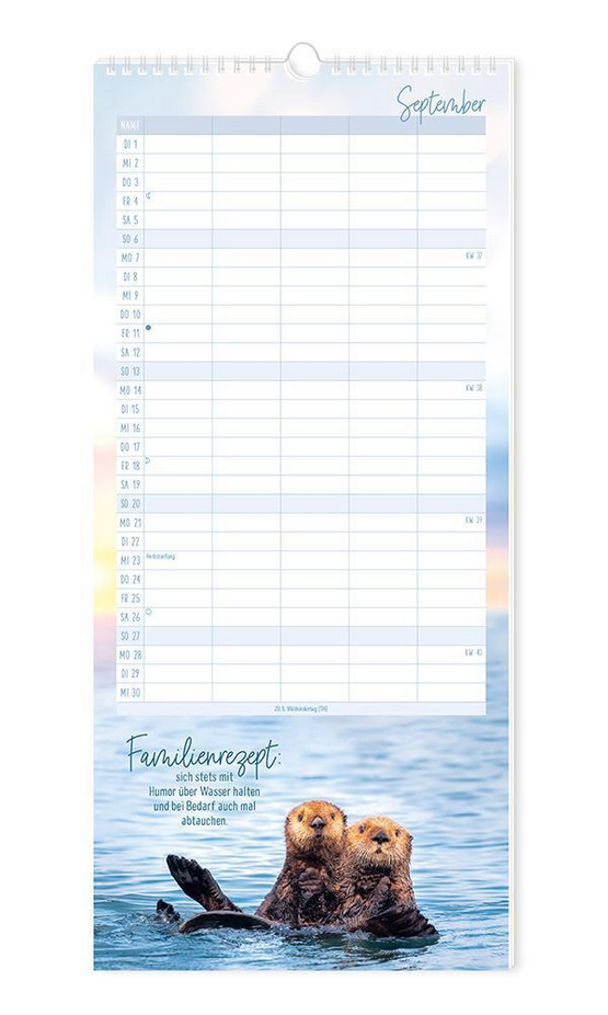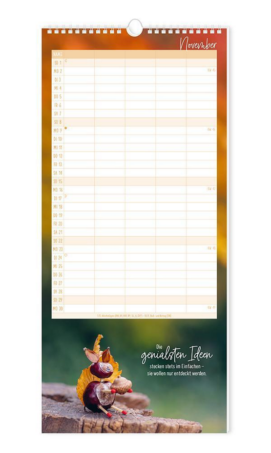 Dieser Familienplaner ist der perfekte Jahresplaner für bis zu 5 Personen. Ein Monat auf einer Seite und 5 extra grosse Spalten sorgen für den perfekten Überblick und leiten die ganze Familie durch den Alltag. Schlichtes Design in Kombination mit motivierenden Sprüchen sorgen Monat für Monat für gute Laune. Feiertage und Schulferien sind im Familienplaner natürlich eingetragen. Ein zusätzliches Highlight ist der extra Adventskalender für eine schöne Vorweihnachtszeit.