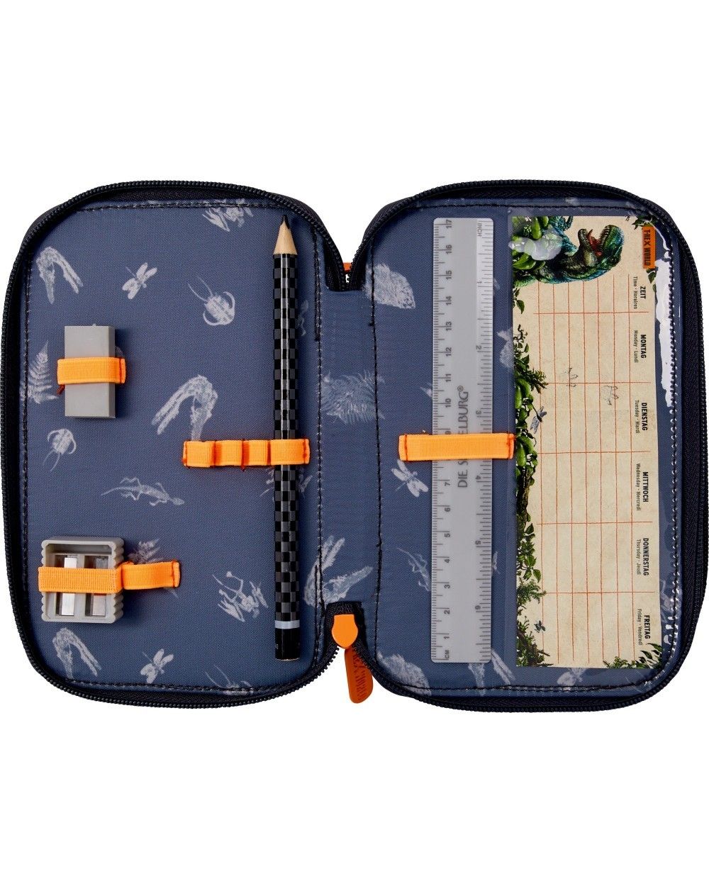 Mit seinen 3 Fächern bietet das geräumige Federmäppchen T-REX WORLD mit 3D-Druck von Die Spiegelburg viel Platz für Stifte, Lineal und Co.