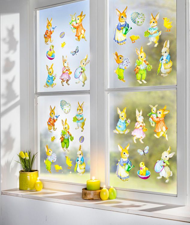 34 österliche Fenstersticker Hinreißende nostalgische Motive 4 Bögen mit 2 unterschiedlichen Designs Mit zartem Glitter veredelt Fenstersticker "Hasenfreunde" 34-teilig zauberhafte Osternostalgie Gibt sich auch bei Ihnen bald eine niedliche Hasenfamilie ein Stelldichein? Diese Fenstersticker im nostalgischen Look wecken die Vorfreude auf die Osterzeit. Niedliche Hasenmotive, dazwischen Ostereier und lustige Küken: auf vier Stickerbögen mit zwei unterschiedlichen Motivzusammenstellungen tummeln sich die Hasenfreunde. Irirsierender Glitter akzentuiert die liebevoll ausgearbeiteten Illustrationen der Sticker. Wählen Sie selbst die Zusammenstellung und verzieren Sie Fenster, Spiegel, Kühlschrank oder andere glatte Flächen mit diesen selbsthaftenden Folienaufklebern. Nach Ostern lassen sich die Sticker ganz einfach rückstandslos wieder abziehen. Fenstersticker "Hasenfreunde" 34-teilig: - 34 Fenstersticker aufgeteilt auf 4 Stickerbögen - Je 2 Bögen mit unterschiedlichen Motiven - Wasserfest - Leicht anzubringen - Rückstandslos wieder ablösbar - Maße: 4-12 x 3,5-20 cm (BxH) Freuen Sie sich auf eine bezaubernde Hasenparade und bestellen Sie jetzt online die Fenstersticker "Hasenfreunde" 34-teilig.