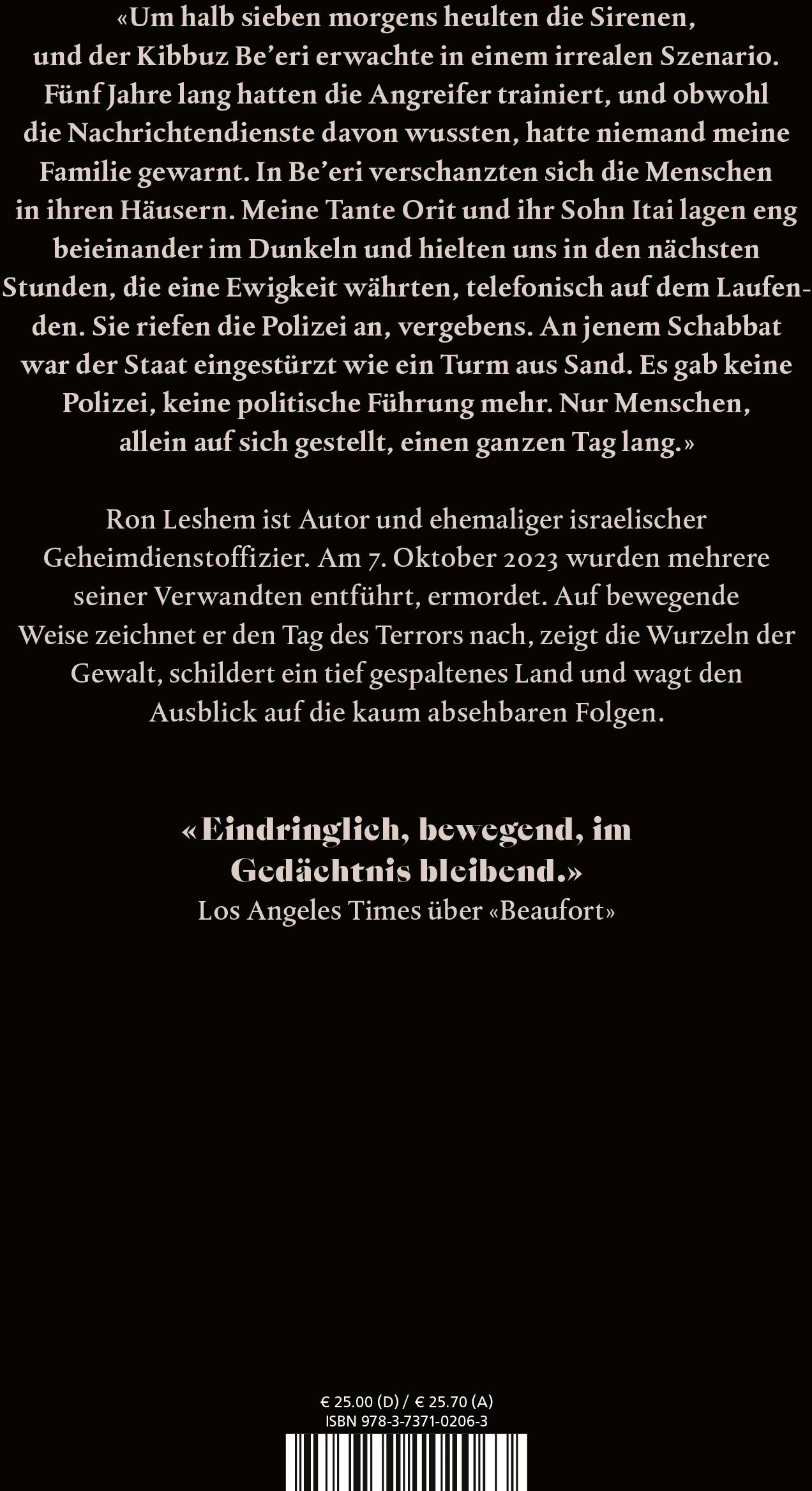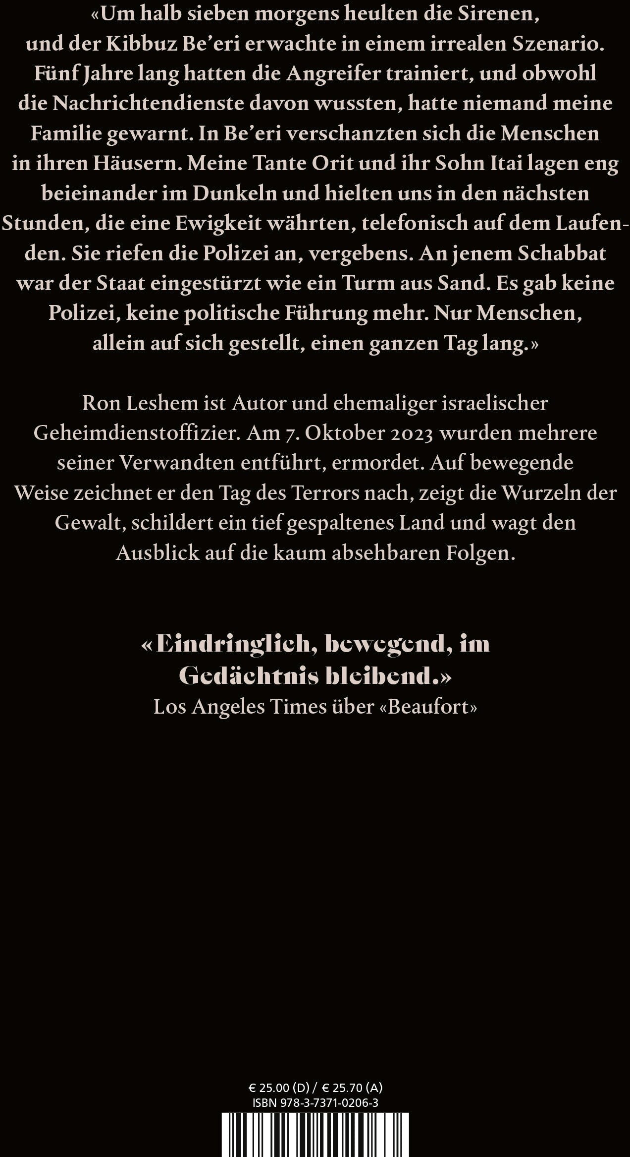 Am 7. Oktober 2023 überzog die Hamas Israel mit Terror, seither hält die Welt den Atem an - und überschlagen sich die Ereignisse. Ron Leshem zeichnet in seinem bewegenden Text jenen Tag und die Entwicklungen seither nach - und führt ein zutiefst gespaltenes Land vor Augen. Gerade der liberale, auf Verständigung bedachte Teil der Gesellschaft wurde getroffen. Was werden die Folgen sein?Leshem, international bekannter Autor («Euphoria», «Beaufort»), Journalist und ehemaliger israelischer Geheimdienstoffizier, ist auch persönlich betroffen. Die Hamas ermordete seinen Onkel und seine Tante, verschleppte seinen Cousin, der auch deutscher Staatsbürger war, als Geisel. Ein Blick in die Wirklichkeit Israels, der uns das Land auf sehr persönliche Weise nahebringt und zugleich ein grosses Bild vermittelt. Das Buch zur Stunde, das den Konflikt begreifbar macht.