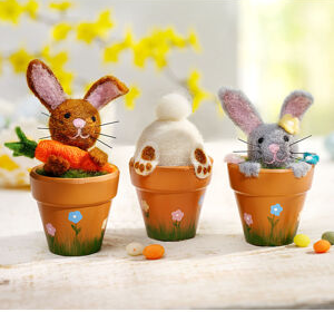 Die ungewöhnliche Kombination von Materialien verleiht dieser Frühlingsdekoration einen außergewöhnlichen Look. Mit viel Liebe zum Detail gestaltete Filzhasen schauen aus handbemalten Terrakotta-Blumentöpfen hervor. Material: Filz, Keramik Maße: Höhe 9-12 cm.