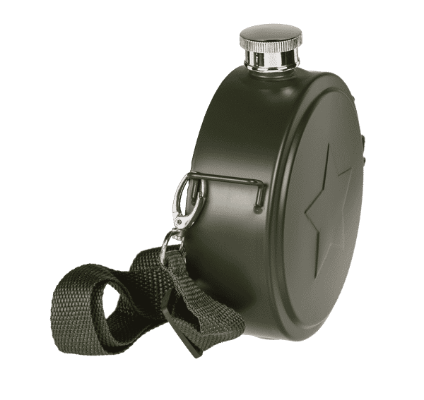 Alles, was man braucht: Der schwarz lackierte Flachmann im Military-Look sieht nicht nur gut aus. Die Edelstahlflasche besitzt einen fest schliessenden Schraubdeckel. Zudem gibt es einen praktischen Schultergurt, der sich auf die gewünschte Länge einstellen lässt. Dadurch bleiben die Hände frei. Ideal zum Wandern oder wenn gleichzeitig eine Bratwurst konsumiert wird. Denn die Feldflasche, von zwei soliden Karabinerhaken gehalten, baumelt ganz lässig an der Hüfte herab.