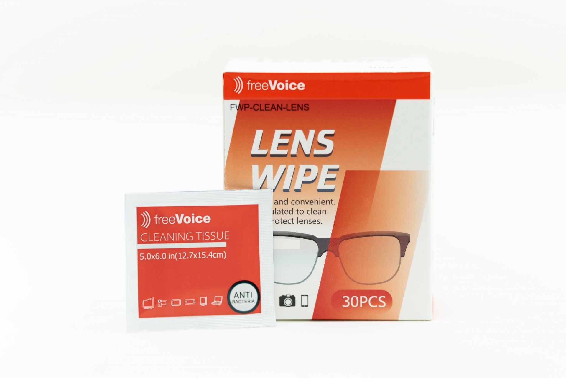 Die perfekte Lösung von freeVoice für saubere, streifenfreie Glas-Oberflächen: hochwertige Feuchttücher, in Masterverpackung und ohne Alkohol.