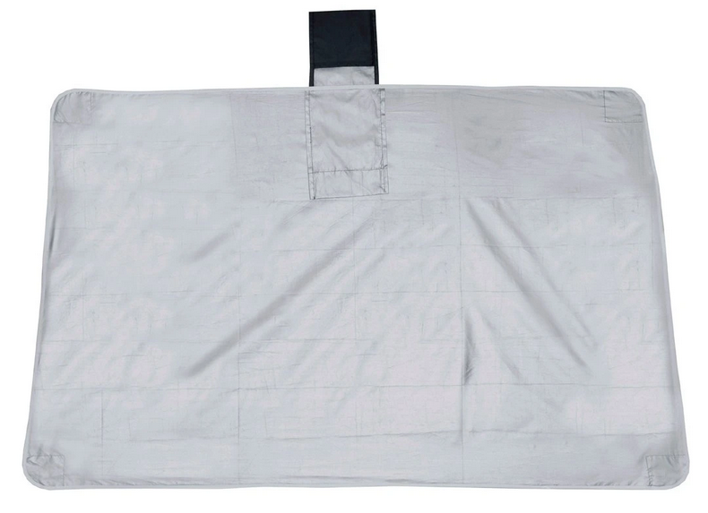 Aus Polyester, die Vorderseite ist silber, die Rückseite schwarz. Abmessungen: 162 x 0,5 x 90 cm