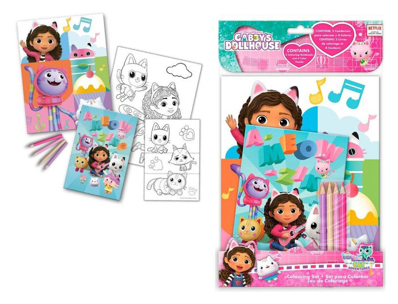 Lassen Sie der Kreativität Ihres Kindes mit dem Gabby's Dollhouse Mal-Set freien Lauf. Das Set beinhaltet 2 Malbücher (DIN A4) und 4 Buntstifte aus Holz.