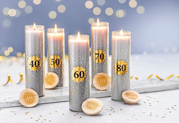 Duftkerze im Geburtstags-Dekorglas Höhe 20 cm Brenndauer: ca. 80 Stunden Feiner Vanilleduft mit 5% Duftanteil Glas mit Konfetti-Dekor in Gold & Silber Mit Aromaschutz-Deckel aus Holz Für Geburtstag, Jubiläum & Co. Zum Verschenken: Geburtstagskerze im Glas "80 Jahre" Hoch soll es leben, das Geburtstagskind! Zum Feiern eines runden Geburtstags gehört eine Kerze einfach dazu. Diese hier ist speziell für den 80. Jahrestag gestaltet: Die Ziffer ziert sowohl das Glas als auch den Deckel. Das Kerzenglas hat sich für diesen Anlass extra fein gemacht. Ein hübscher Konfettiregen in Gold & Silber ziert das Motiv. Das gibt der Geburtstagskerze einen festlichen Anstrich und wirkt deshalb auch besonders dekorativ. Praktisch: Nach dem Abbrennen können Sie Glas und Deckel wiederverwenden! Duftkerze mit Vanillearoma Mit der Kerze können Sie nicht nur stilecht einen runden Geburtstag zelebrieren Sie beduften dazu gleichzeitig die Wohnräume - für eine besonders festliche Atmosphäre! Ihr Vorteil: Die Jubiläumsziffer ziert nur die Vorderseite des Kerzenglases. Sie können die Kerze also weit über den Festtag hinaus nutzen und sich am fröhlichen Konfetti-Dekor erfreuen. Geburtstagskerze im Glas 80 Jahre aus Wachs mit Vanilleduft hochwertig mit 5% Duftanteil Abbrenndauer ca. 80 Stunden Aromaschutzdeckel aus Holz mit dekorierter 80 Maße: Höhe 20,5 cm, Ø 5,5 cm. Als Geschenk zum Geburtstag oder Mitbringsel zur Geburtstagsfeier: Die Geburtstagskerze im Glas "80 Jahre" macht einen runden Geburtstag erst so richtig komplett. Bestellen Sie jetzt gleich bei uns im Online-Shop!