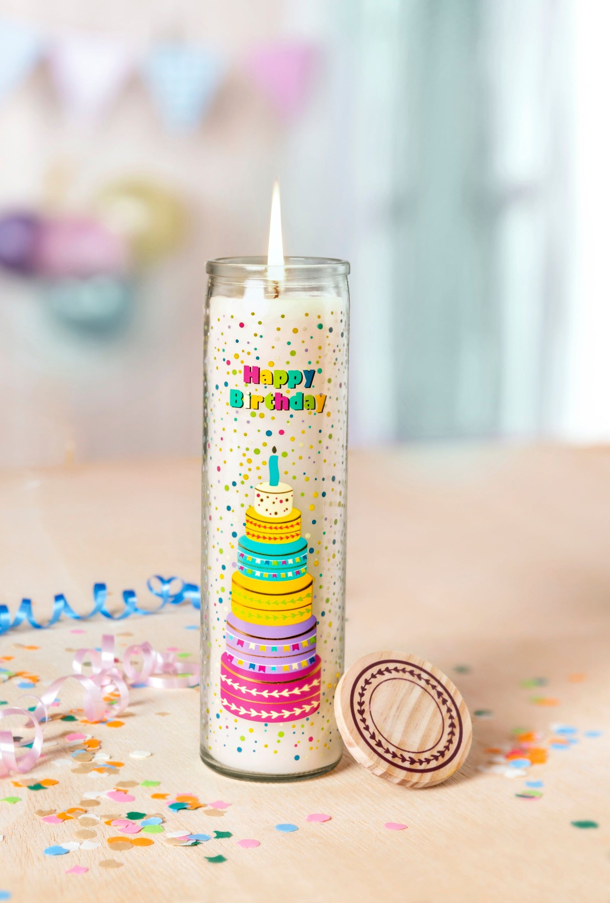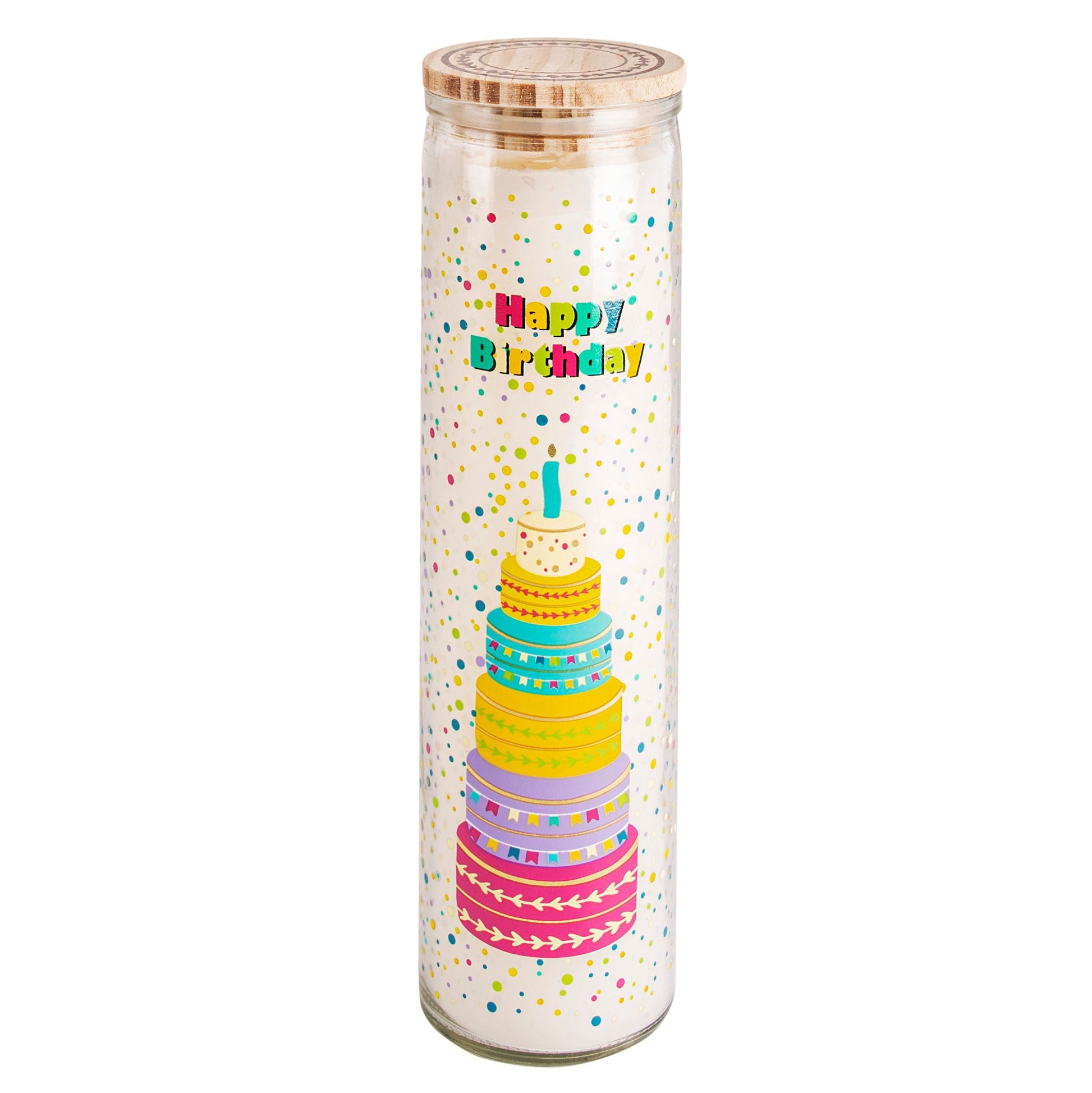 Eine Kerze gehört einfach zum Geburtstag! Besonders schön wird es, wenn sie auch noch so angenehm vanillig duftet wie diese hier. Die große, cremeweiße Kerze kommt im Glas mit einem kunterbunten "Happy Birthday"Aufdruck und großem Torten-Print - so ist für den Geburtstagskuchen auch schon gesorgt. Zumindest symbolisch.