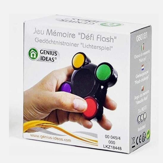 Dieses handliche Spiel ist ideal, um das Gedächtnis auf spielerische Weise zu trainieren! Im Zufallsmodus leuchtet eine Farbe auf, die gedrückt werden muss - bei Erfolg fügt der Gedächtnistrainer eine weitere Farbe hinzu. Das Gerät kann bis zu 15 Farben nacheinander darstellen, wenn sie in der richtigen Reihenfolge gedrückt werden! Kann überall und jederzeit verwendet werden, für Jung und Alt geeignet. Wird mit 3 Batterien vom Typ AG13 betrieben (im Lieferumfang enthalten).