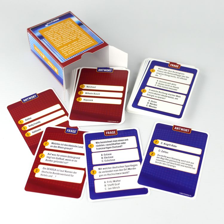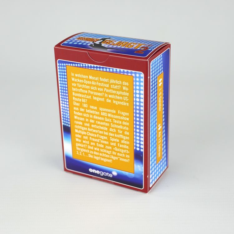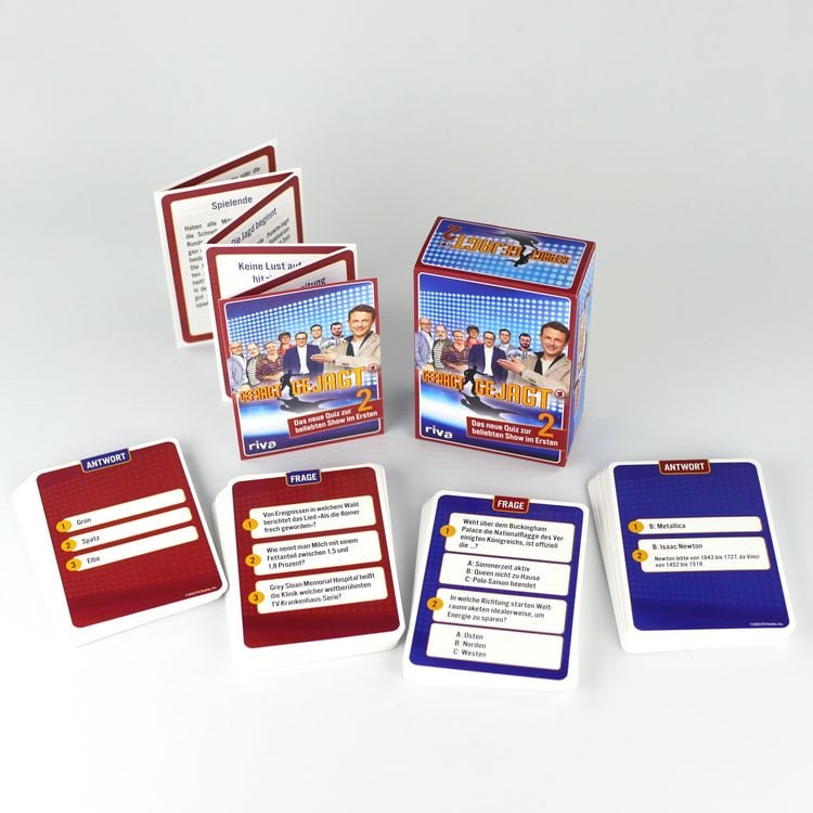 Zeit für eine spannende Quiz-Runde! Welche Insel ist die größte Spaniens? Wodurch werden Daten in Glasfaserkabeln transportiert? Und welche Form des Lernens macht sprichwörtlich den Meister? Im zweiten Teil des Kartenspiels zur beliebten ARD-Quizshow Gefragt – Gejagt gibt es über 180 neue spannende Fragen aus den verschiedensten Themenbereichen. Testet euer Wissen in der Schnellraterunde und sammelt noch mehr Punkte beim Beantworten der Multiple-Choice-Fragen. Wer ist am Ende euer persönliches Quizgenie? Und wie hättet ihr alle gegen eine Jägerin oder einen Jäger abgeschnitten? Viel Spaß beim Quizzen!