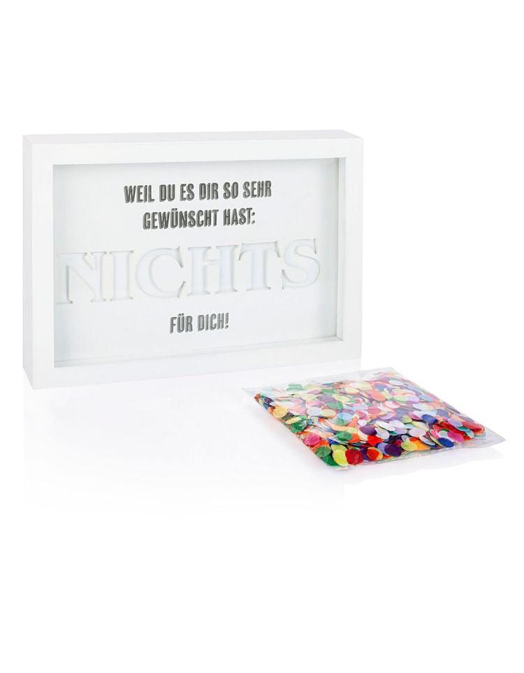 Originelle Verpackung für Geldgeschenke oder Gutscheine Perfekt für Last-Minute-Geschenke Einfach und individuell zu befüllen Lustiger Hingucker auf dem Geschenktisch Mit diesem Bilderrahmen sind Sie fein raus - Geldgeschenke & Co. sind hier im Nu verpackt Tja, so kann es gehen, wenn man sich immerzu "Nichts" wünscht - man bekommt tatsächlich einmal "Nichts". Allerdings nur auf den ersten Blick. Denn bei diesem Bilderrahmen erkennt der Beschenkte erst auf den zweiten Blick, dass sich dann doch mehr als nichts darin befindet. Der große Holz-Bilderrahmen enthält ein Passepartout mit der Aufschrift: Weil du es dir so sehr gewünscht hast: NICHTS für dich. Doch vor der Übergabe kann der Schenkende ganz einfach ein paar Geldscheine oder einen Gutschein hinter das Passepartout legen - so dass es dann durch die ausgestanzten Lettern des "NICHTS" scheint. So wird nach dem ersten Schreck die Freude doch noch groß sein! Zum zusätzlichen Dekorieren liegt Konfetti bei, das Sie in den Bilderrahmen geben können. Bilderrahmen "NICHTS": für Geld- oder Gutscheingeschenke schnell und stilvoll verpackt zum Hinstellen oder Aufhängen Maße: 26 x 3,5 x 18 cm Material: Holz, Glas, Karton Bestellen Sie den originellen Bilderrahmen für Ihr nächtes Geldgeschenk gleich jetzt hier online - und sorgen Sie damit für Staunen und viele Lacher! .