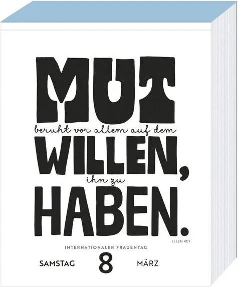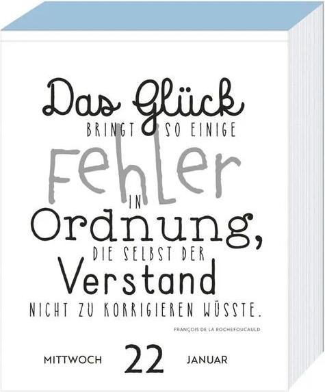 Freuen Sie sich über einen positiven Leitspruch für jeden Tag, z.B.: "Der Optimist sieht die Rose, der Pessimist die Dornen.", "Lebenskünstler ist, wer seinen Sommer so erlebt, dass er ihm noch den Winter wärmt." (Alfred Polgar), "Das Leben ist zu wichtig, um es ernst zu nehmen." (Oscar Wilde), "Es ist mir völlig gleichgültig, wohin das Wasser fließt, solange es nicht in meinen Wein läuft." (Gilbert Keith Chesterton), "Mut beruht vor allem auf dem Willen, ihn zu haben." (Ellen Key) u.v.m.