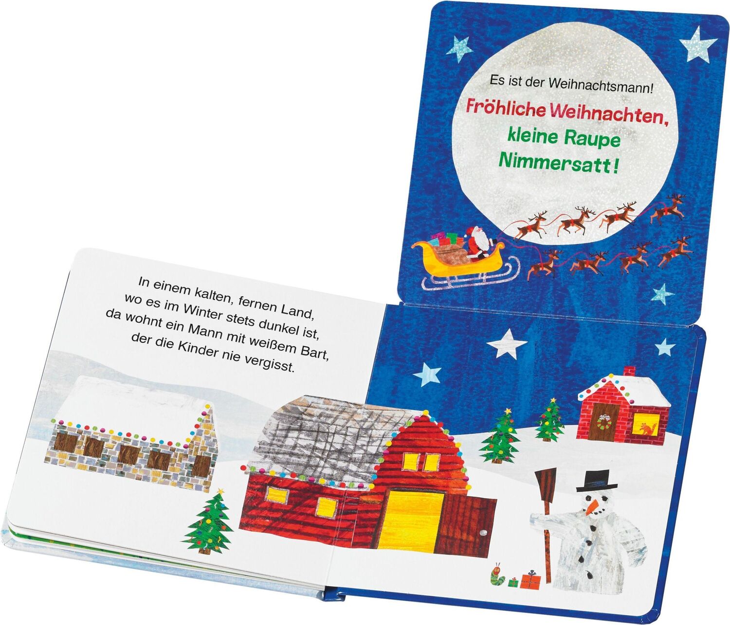 An Heiligabend, während draußen Schnee und Sterne glitzern, zieht sich der Weihnachtsmann warm an und geht die Rentiere füttern, denn ihnen steht die schönste Aufgabe des Jahres bevor: Mit dem voll beladenen Schlitten ziehen sie los und bringen die Geschenke. Wie gut, dass der Weihnachtsmann dabei eine Helferin hat: die kleine Raupe Nimmersatt!