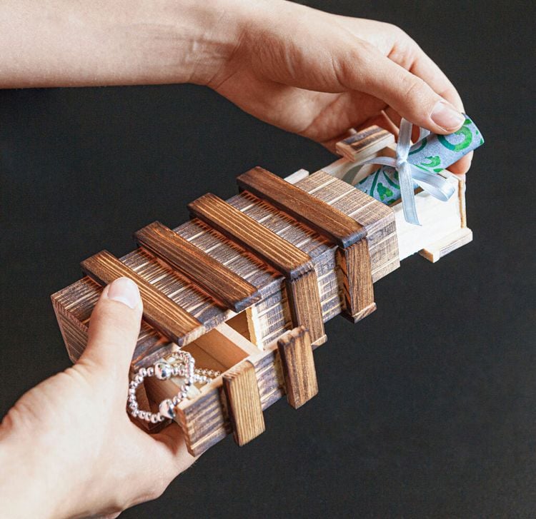Praktisches 2er-Set Jede Schatzkiste mit 2 Geheimfächern Aus Holz Für Privates oder als Geschenkverpackung Die knifflige Geschenkbox zum Tüfteln und Freuen! In dieser "Schatztruhe" sind kleine Geschenke besonders "sicher" verpackt: Das Holz-Kistchen hat zwei Geheimfächer - und die muss man erstmal finden. Von Außen sind sie nämlich nicht zu erkennen. Da ist es gar nicht so einfach, an den Inhalt zu gelangen. Und das ist ja manchmal auch gut so. Kleine Geheimnisse und Privatsachen sind daher auch gut aufgehoben in der Schatztruhe. Ideal zum Verpacken und Verschenken von Geld, Schmuck, Gutscheinen u.v.m. Dank der schönen Optik sind die Geschenkboxen "Schatztruhe" auch für feierliche Anlässe gut geeignet: zu Weihnachten, für Hochzeiten, Jubiläen u.v.m. Geschenkbox "Schatztruhe", 2er-Set: 2 Holzkisten mit je 2 Geheimfächern je 15,5 x 8,5 x 5,5 cm zum schnellen und raffinierten Verpacken kleiner Geschenke Bestellen Sie sich die originellen Geschenkboxen doch gleich jetzt hier online - sie werden garantiert für Staunen sorgen!