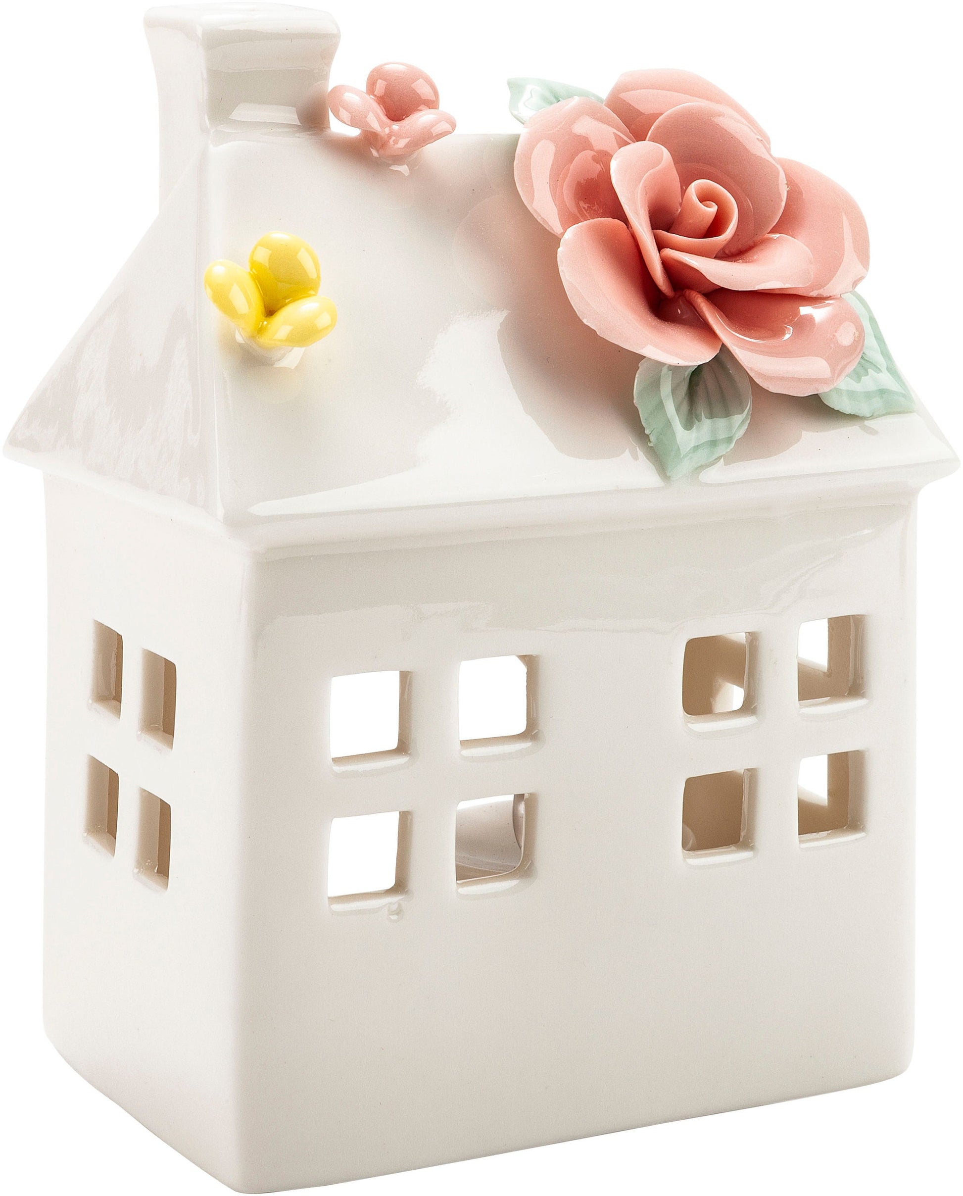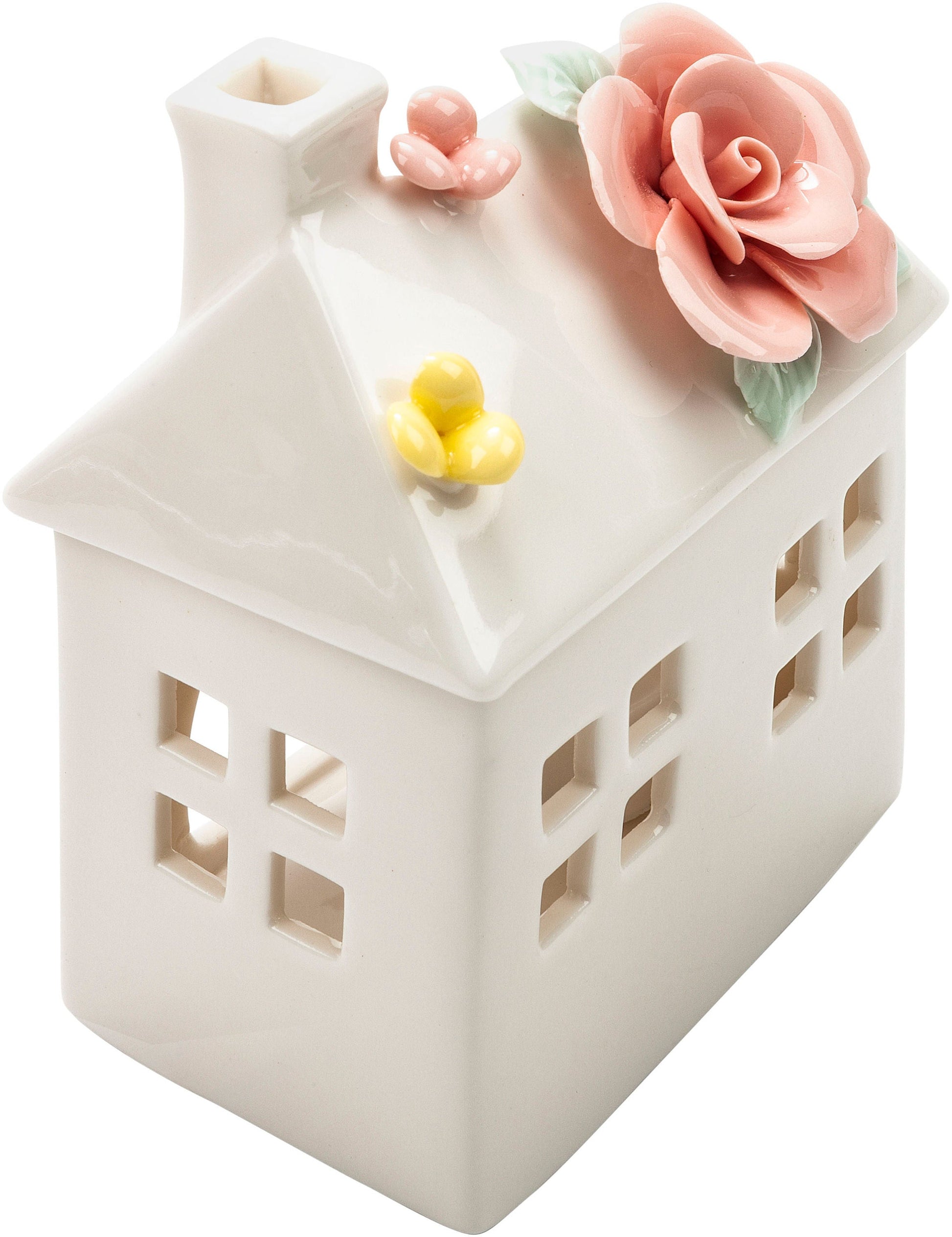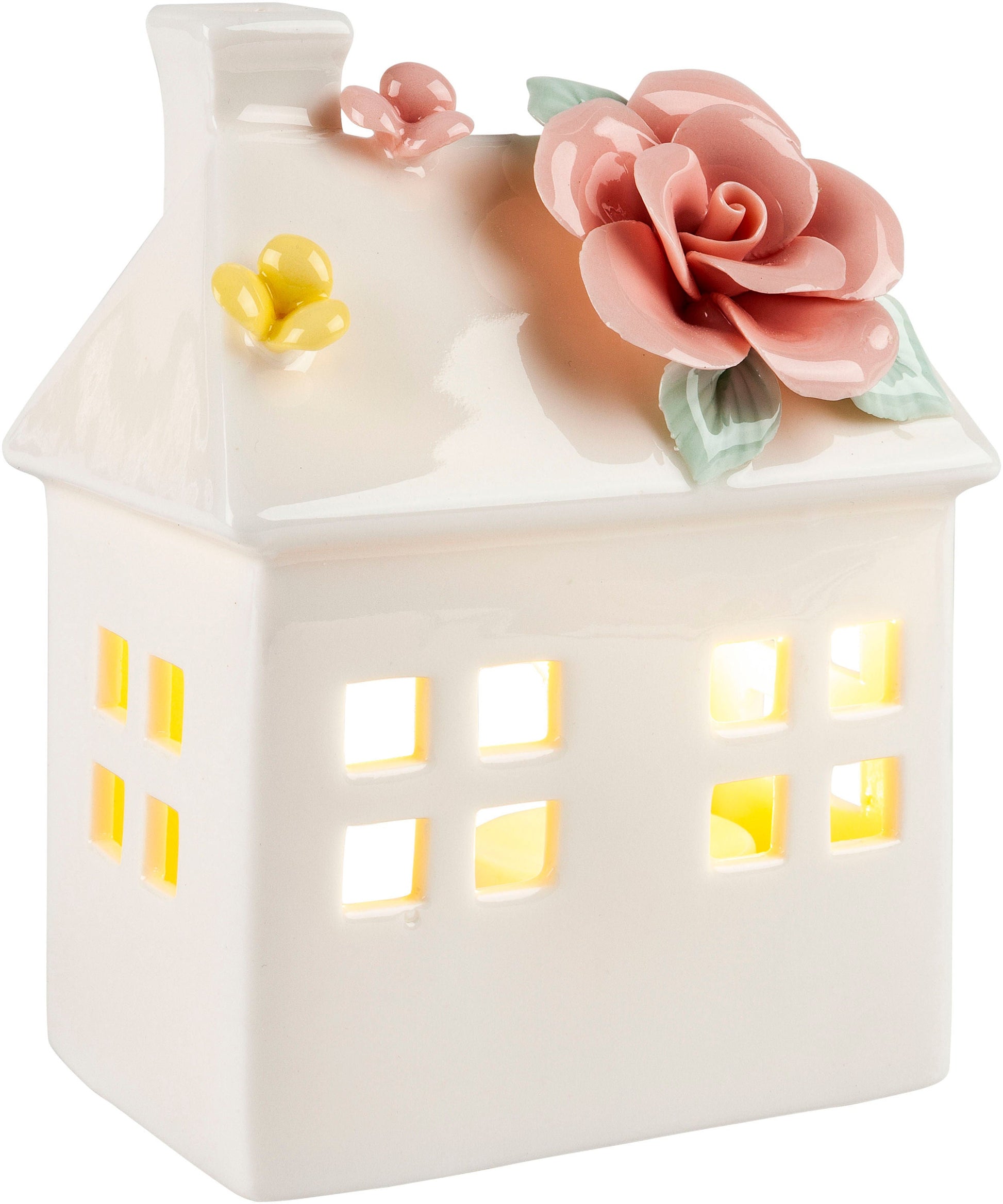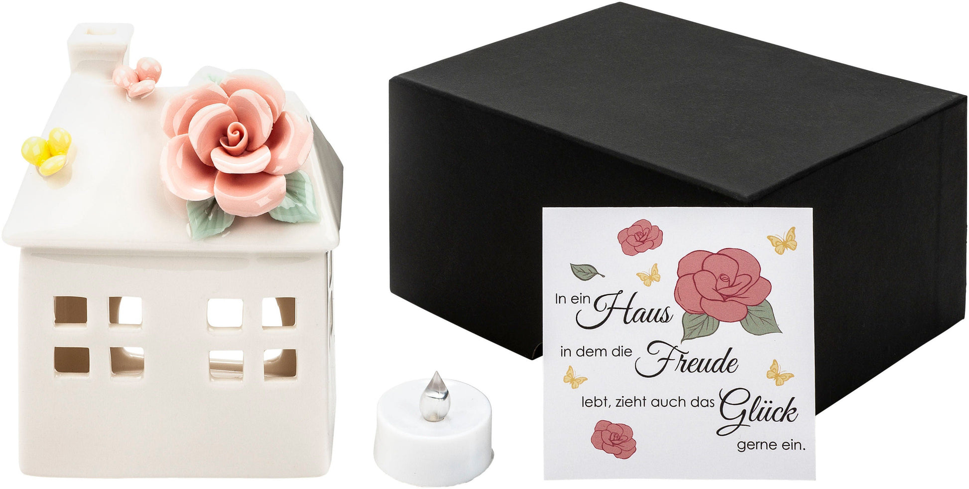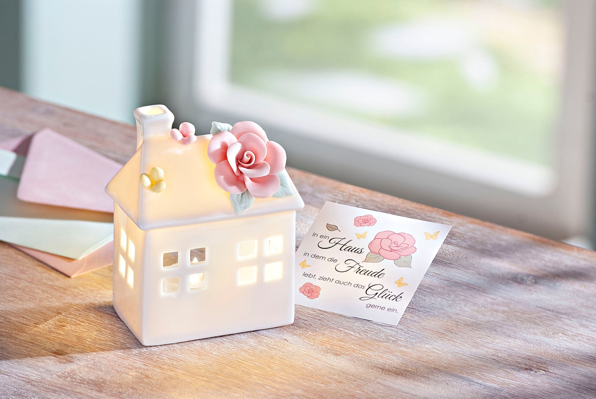 Im Set ist ein sicheres LED-Teelicht enthalten, damit wird das Porzellanhäuschen in den Abendstunden von gemütlichem Lichterschein erhellt. Wer möchte, kann auch ein klassisches Teelicht verwenden.
