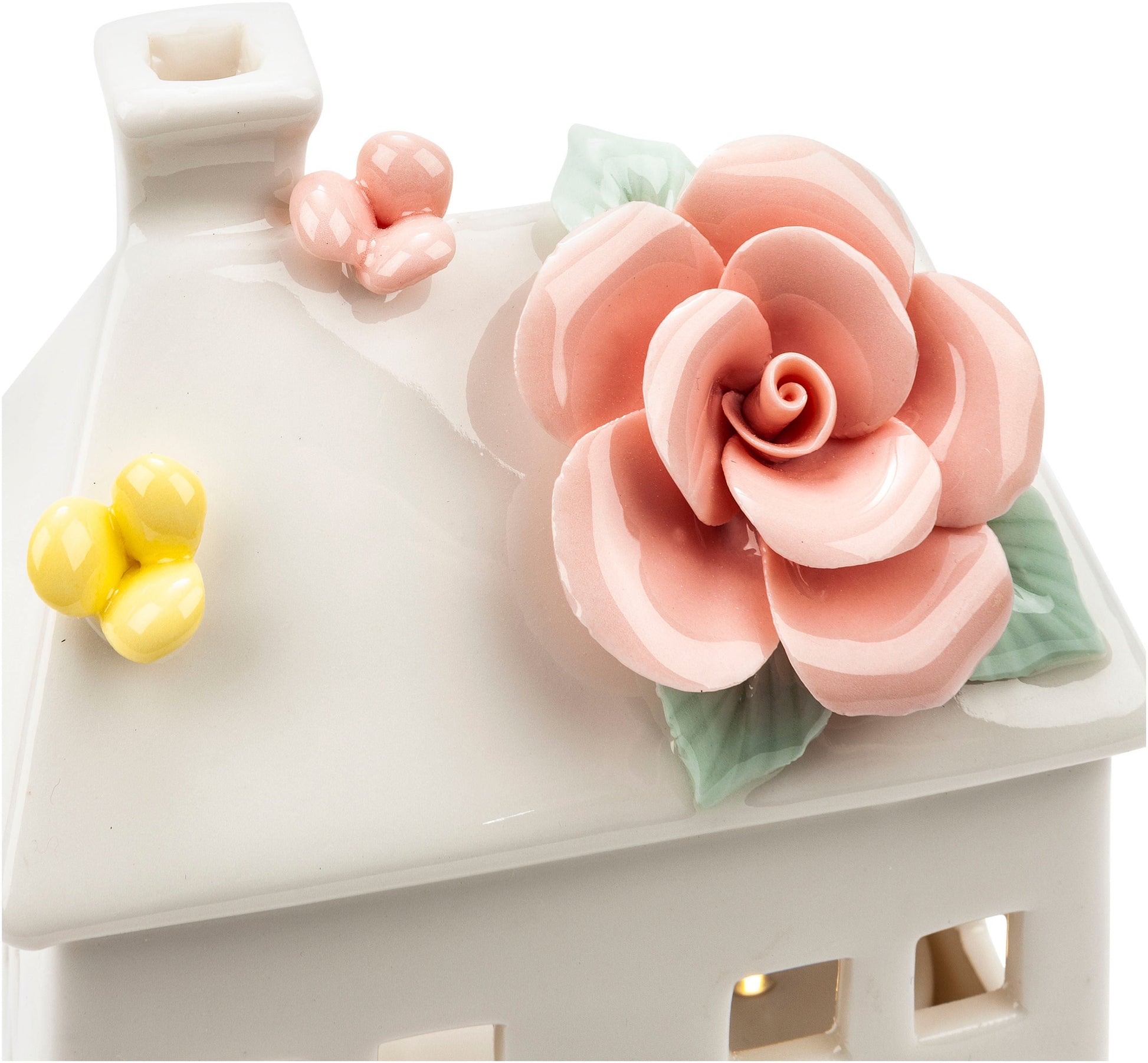 Das behagliche Heim ist aus hochwertigem Porzellan gefertigt, auf dem Dach wachsen Blumen in Pastellfarben, die Sprossenfenster gewähren Ein- und Ausblicke. Bereits tagsüber ein zauberhafter Blickfang, ob auf Fensterbank, Regal, Nachtkästchen …